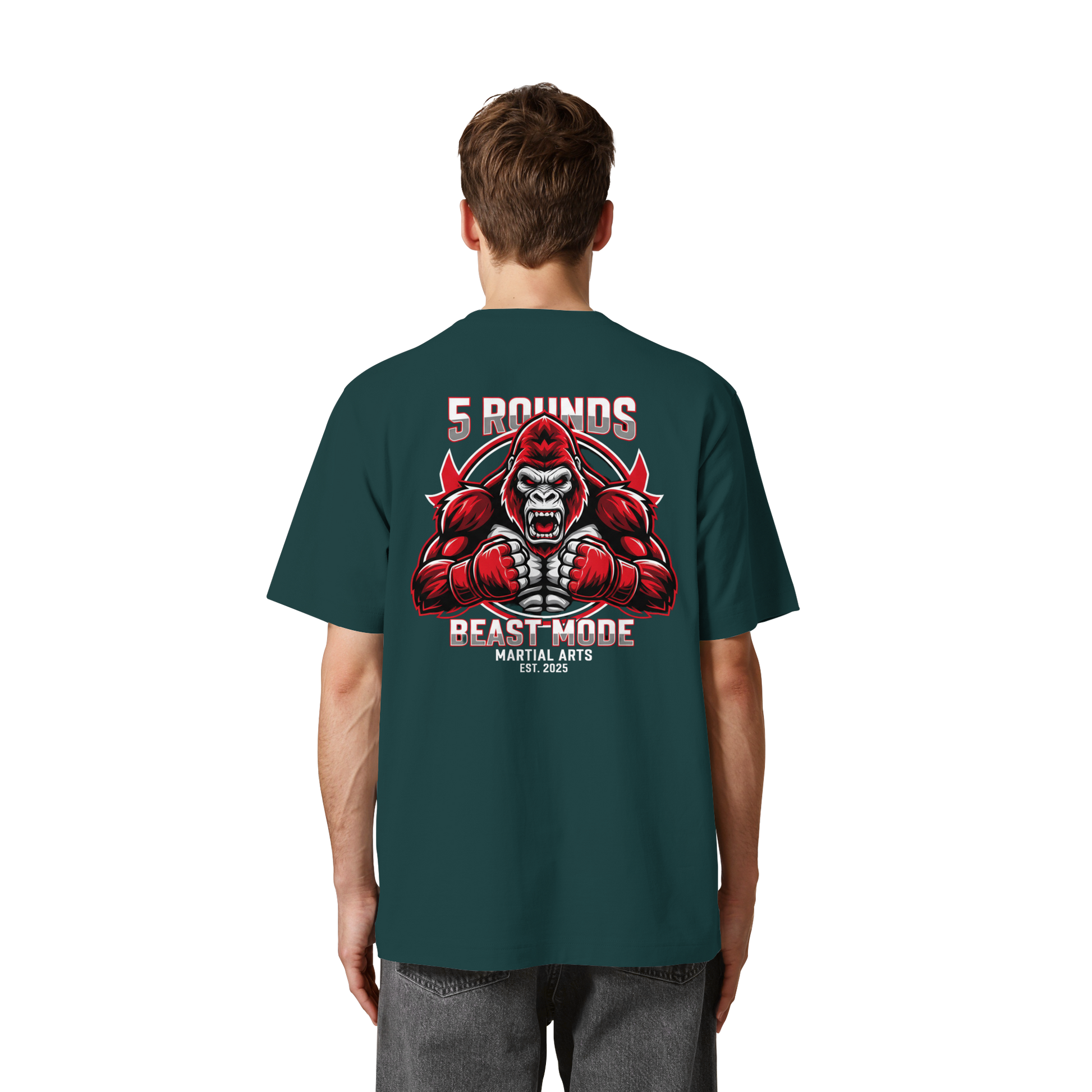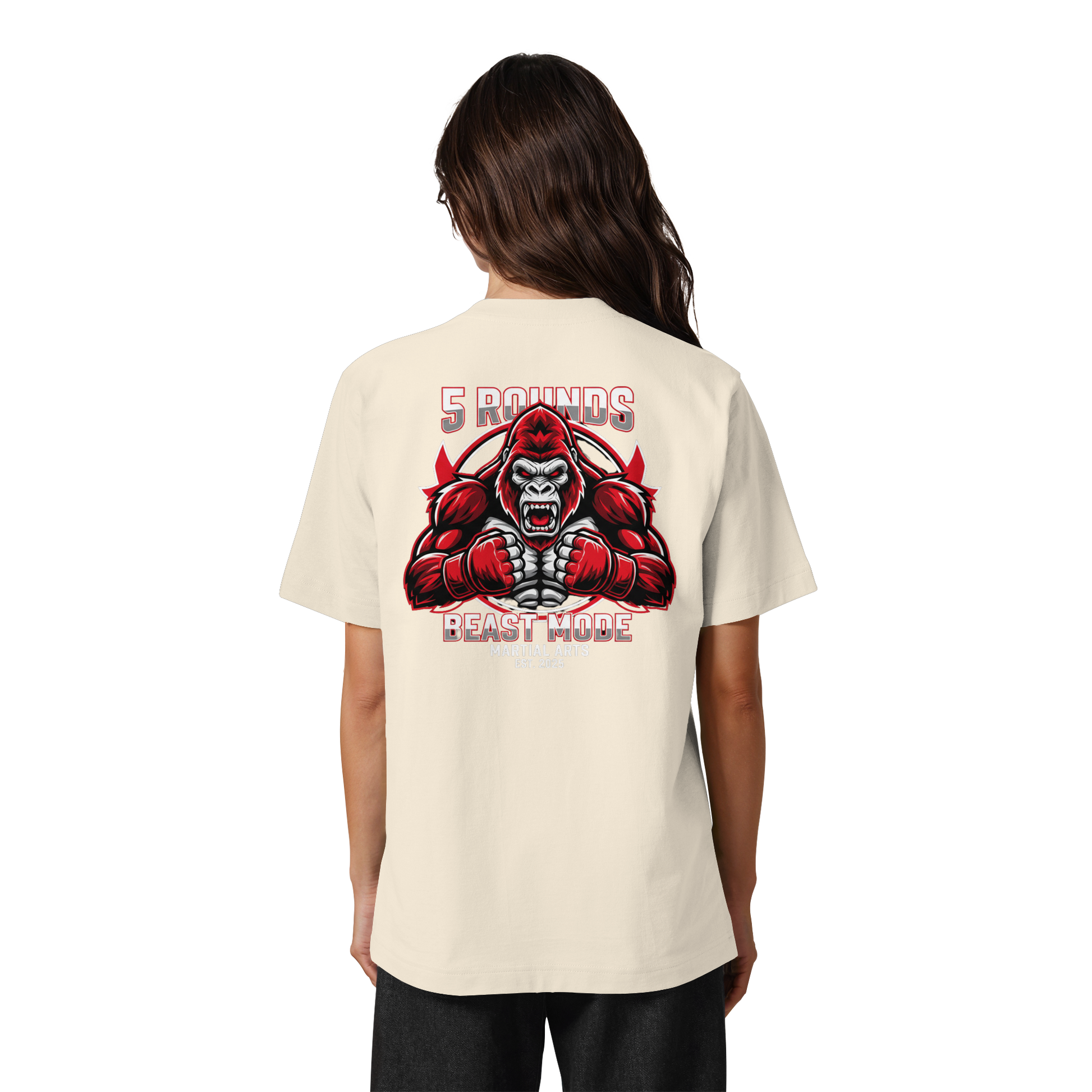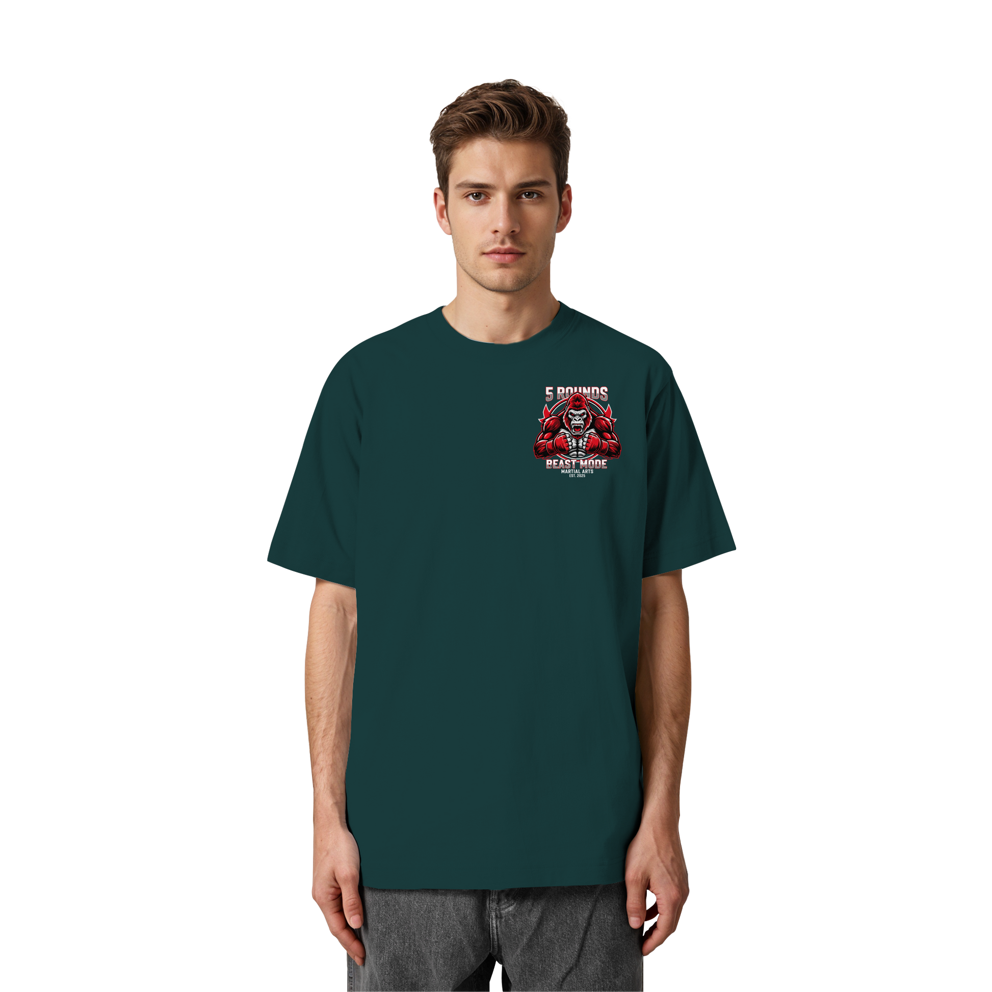 Dieses limitierte Heavy Oversized Organic Shirt vereint Stil und Stärke mit einem kraftvollen BEAST MODE Gorilla-Motiv in Rot, Weiß und Schwarz – kleiner DTF-Druck vorne auf der Brust und großer DTF-Druck auf dem Rücken. Perfekt für diejenigen, die bereit sind, ihre Grenzen zu sprengen! Premium Combat Sports Streetwear aus 100% Bio-Baumwolle für MMA, Kampfsport und Boxing.