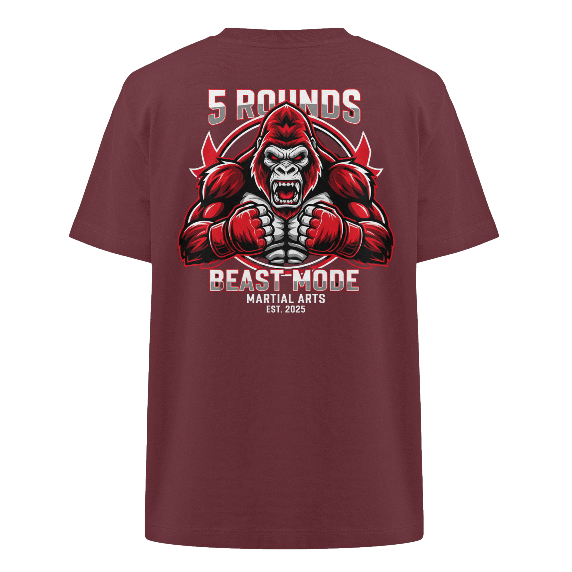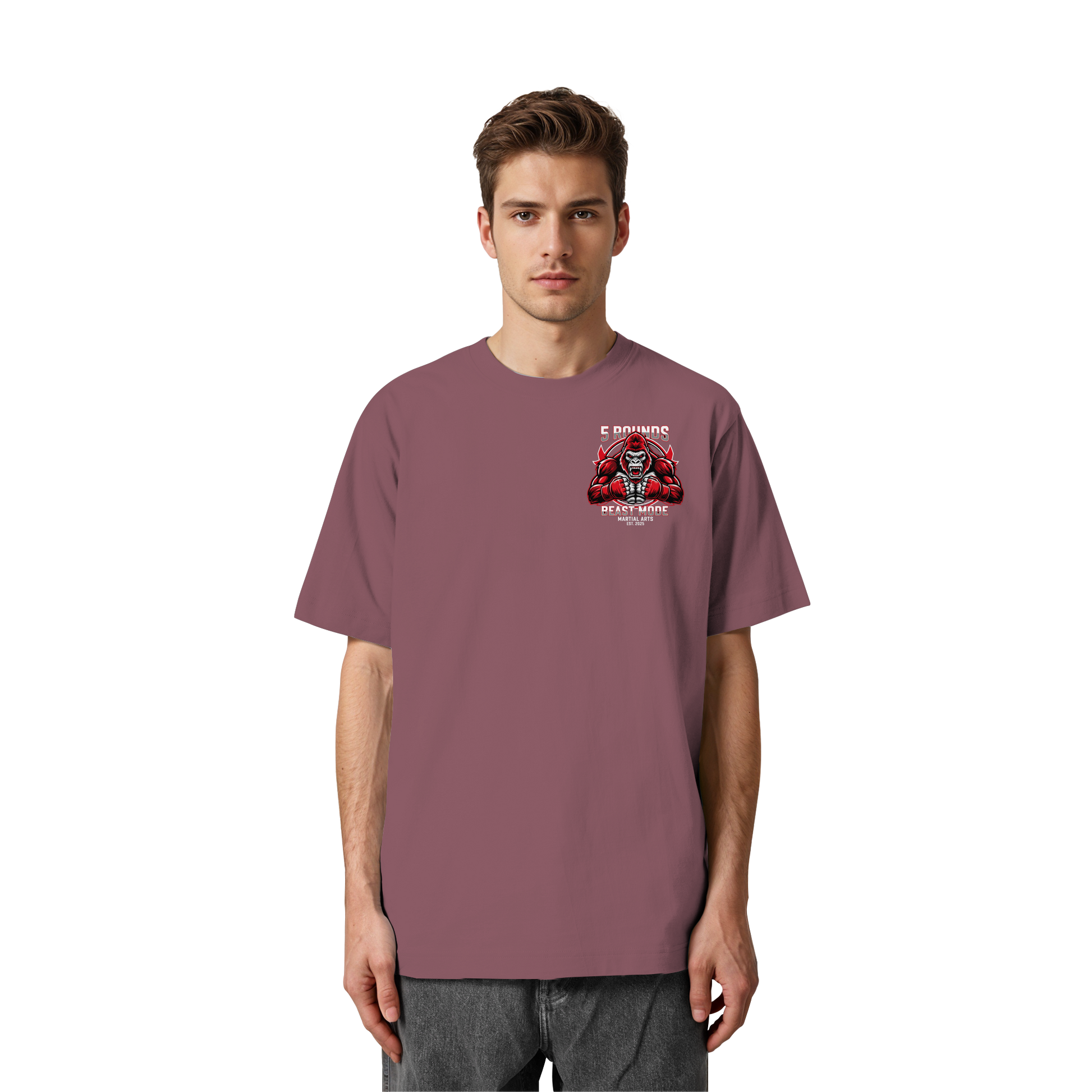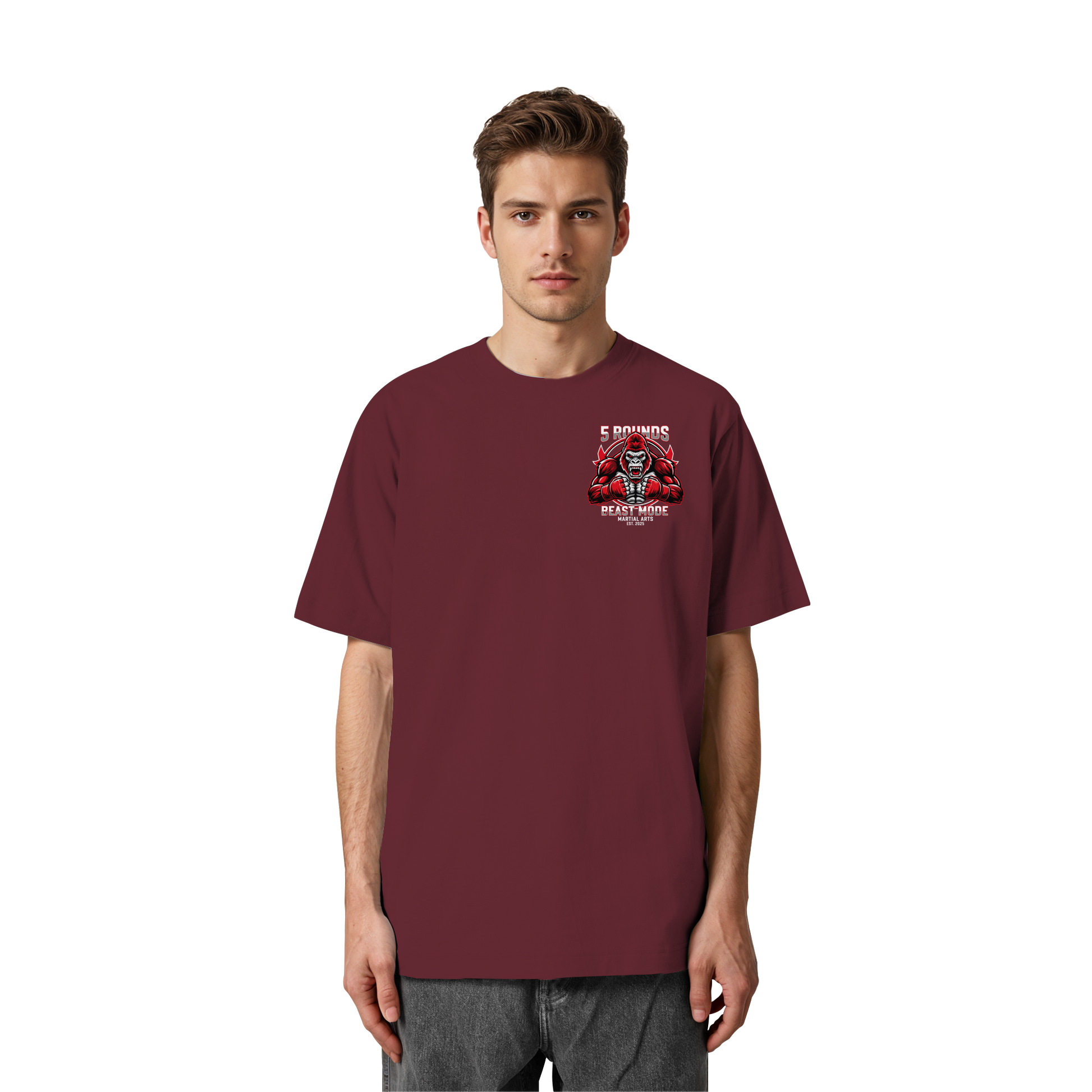 Dieses Premium 5 ROUNDS BEAST MODE Gorilla Heavy Oversized Organic Shirt vereint 100% Bio-Baumwolle mit kraftvollem Design. DTF-Druck vorne klein und hinten groß in Rot, Weiß, Schwarz. DTF ist das beste Druckverfahren für Baumwolle. Erhältlich in 8 Farben: Burgundy, Black, French Navy, Glazed Green, Natural Raw, Kaffa Coffee, Worker Blue, Aloe. Jedes Stück wird individuell hergestellt. Lieferzeit: 5-7 Werktage. Ideal für MMA, Kampfsport und Combat Sports Streetwear.