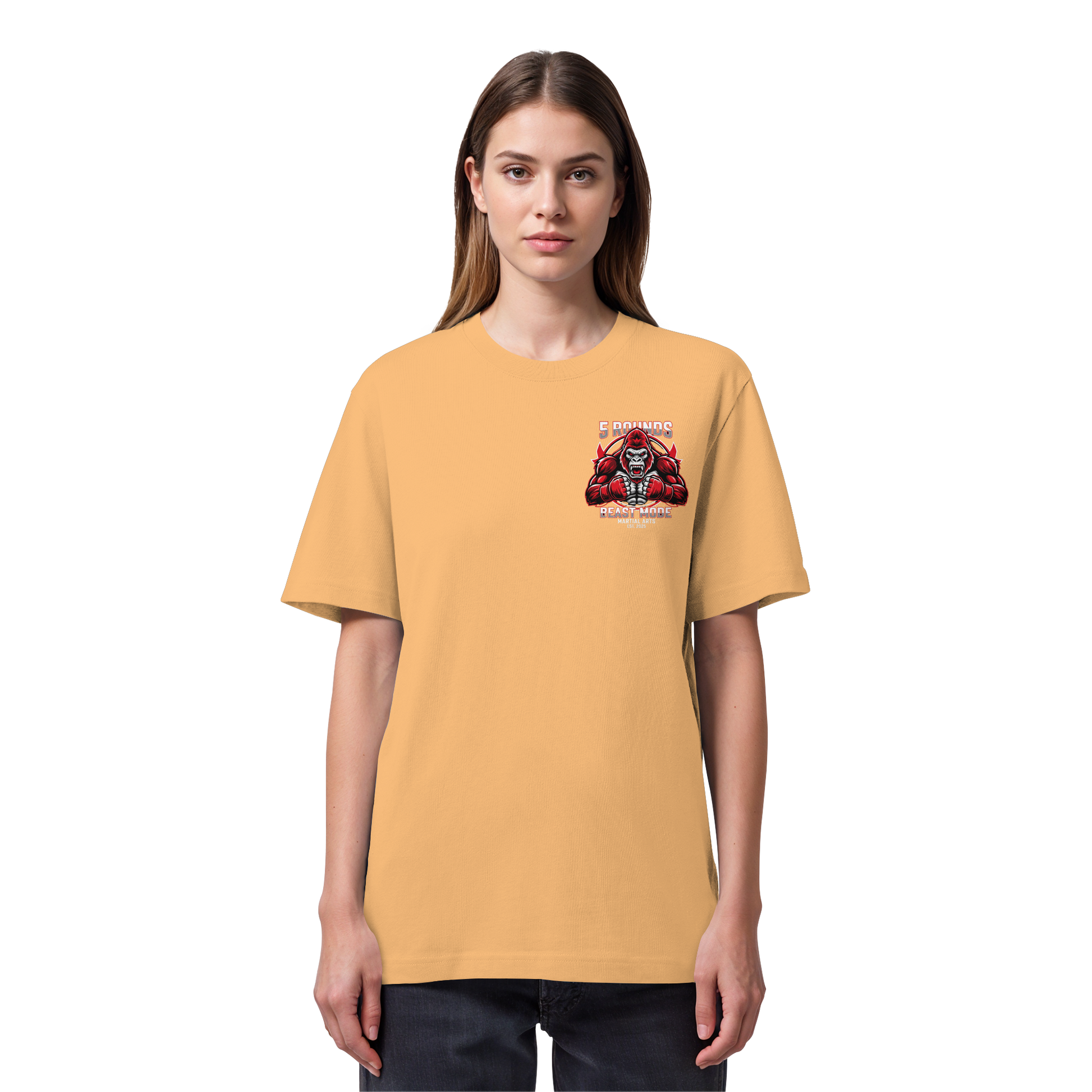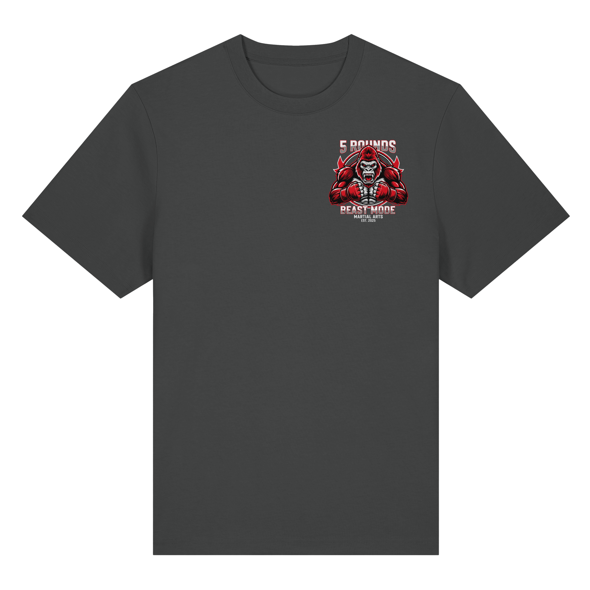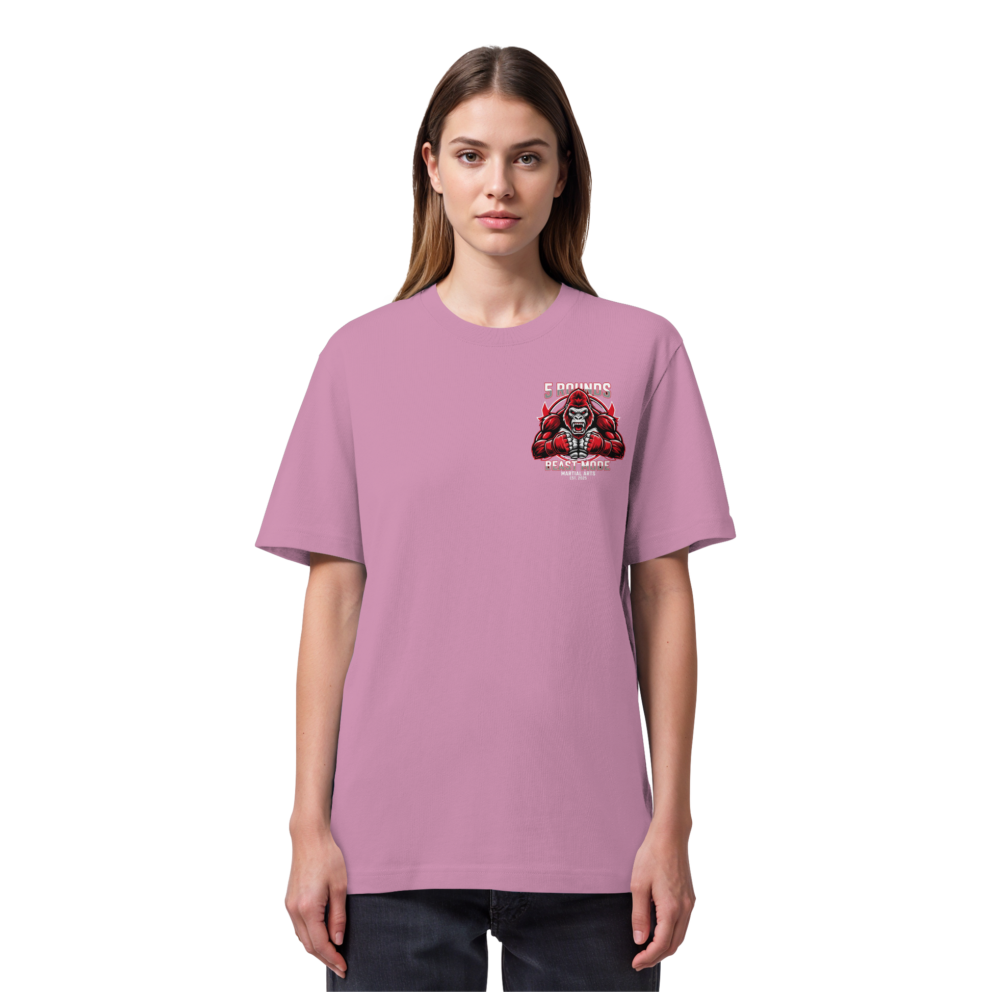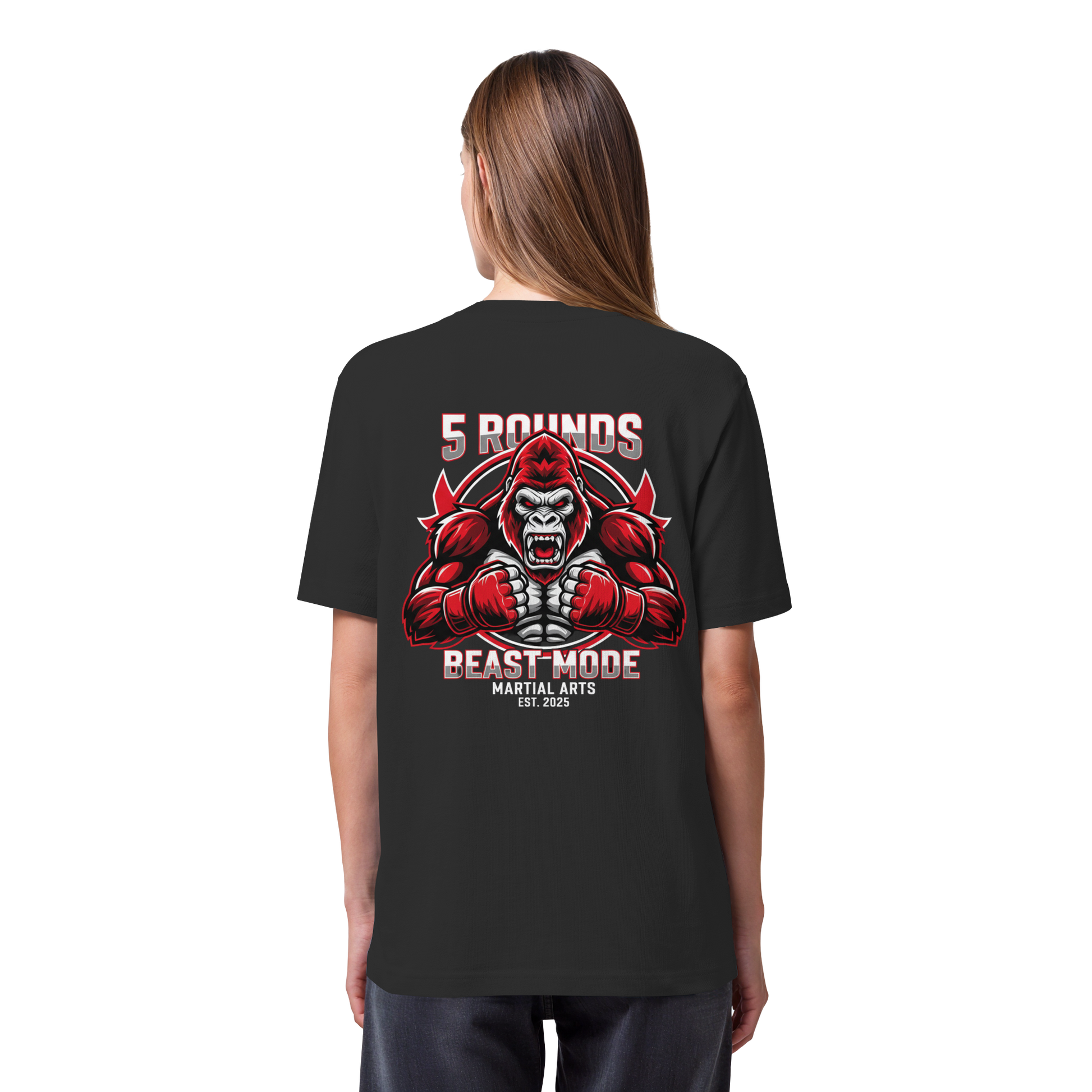 Erlebe das Gefühl von purer Kraft mit dem 5 ROUNDS BEAST MODE Gorilla Organic Heavy T-Shirt. Das kraftvolle BEAST MODE Gorilla-Motiv in Rot, Weiß und Schwarz – kleiner DTF-Druck vorne auf der Brust und großer DTF-Druck auf dem Rücken – symbolisiert unbändige Energie und Entschlossenheit. Premium Combat Sports Streetwear aus 100% Bio-Baumwolle für MMA, Kampfsport und Boxing.