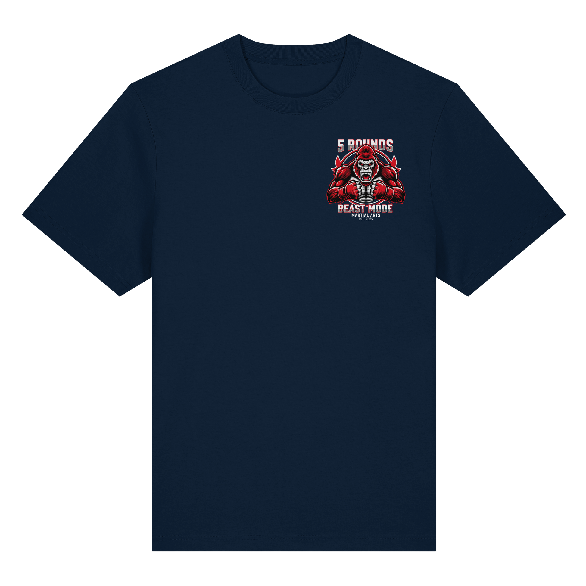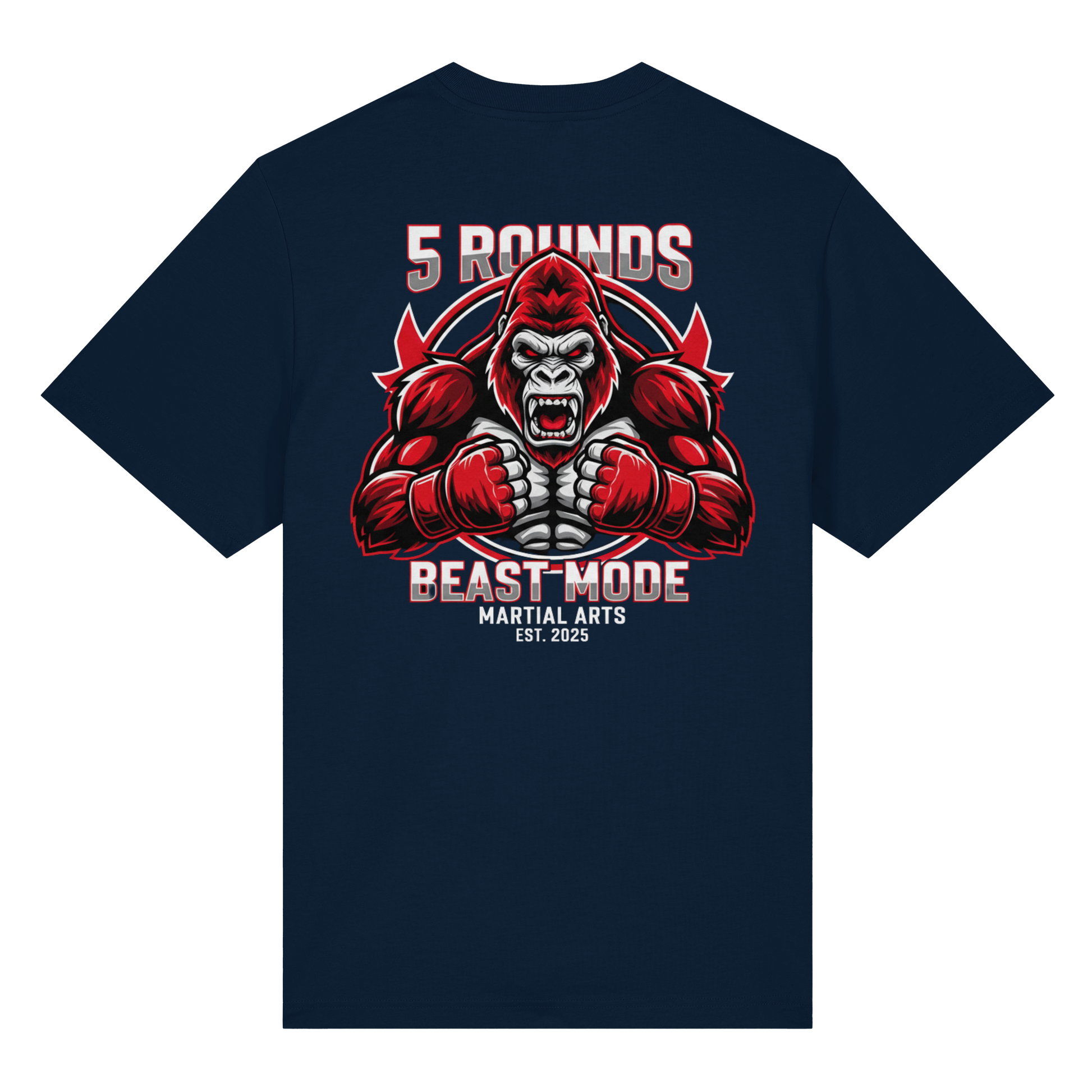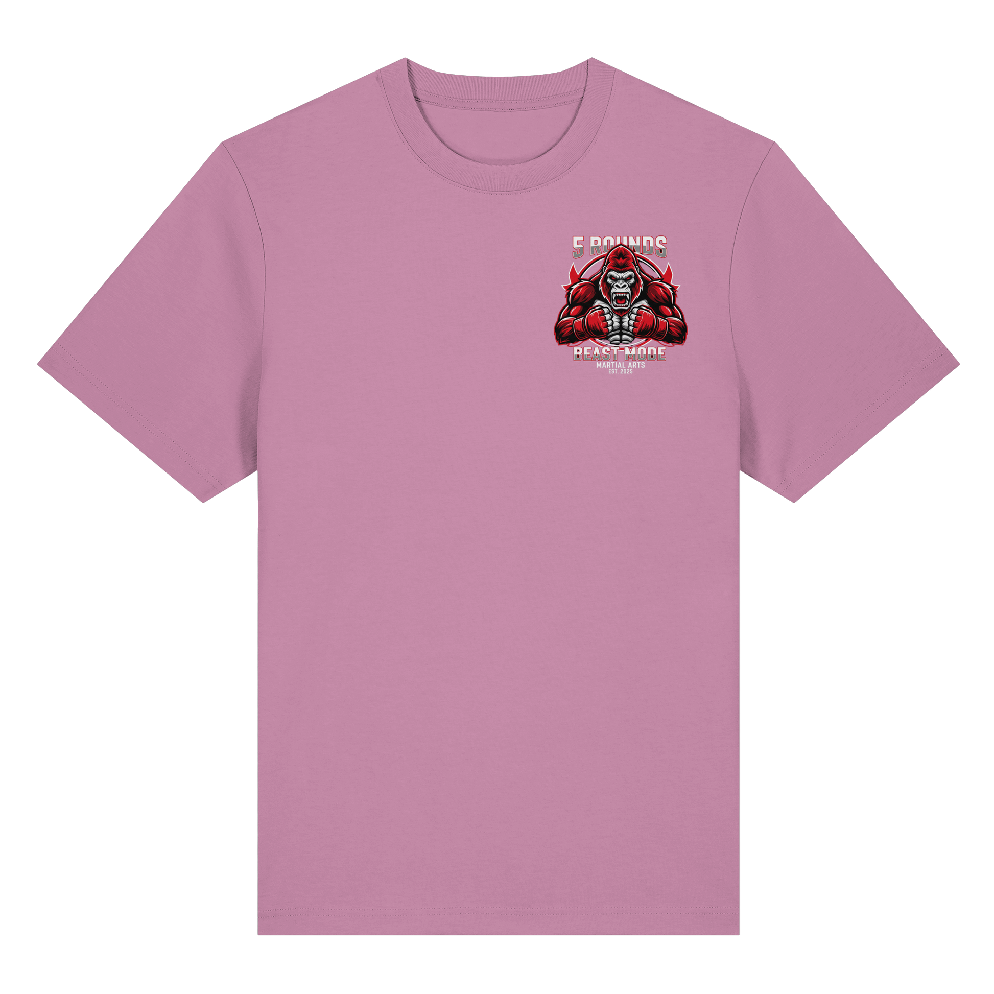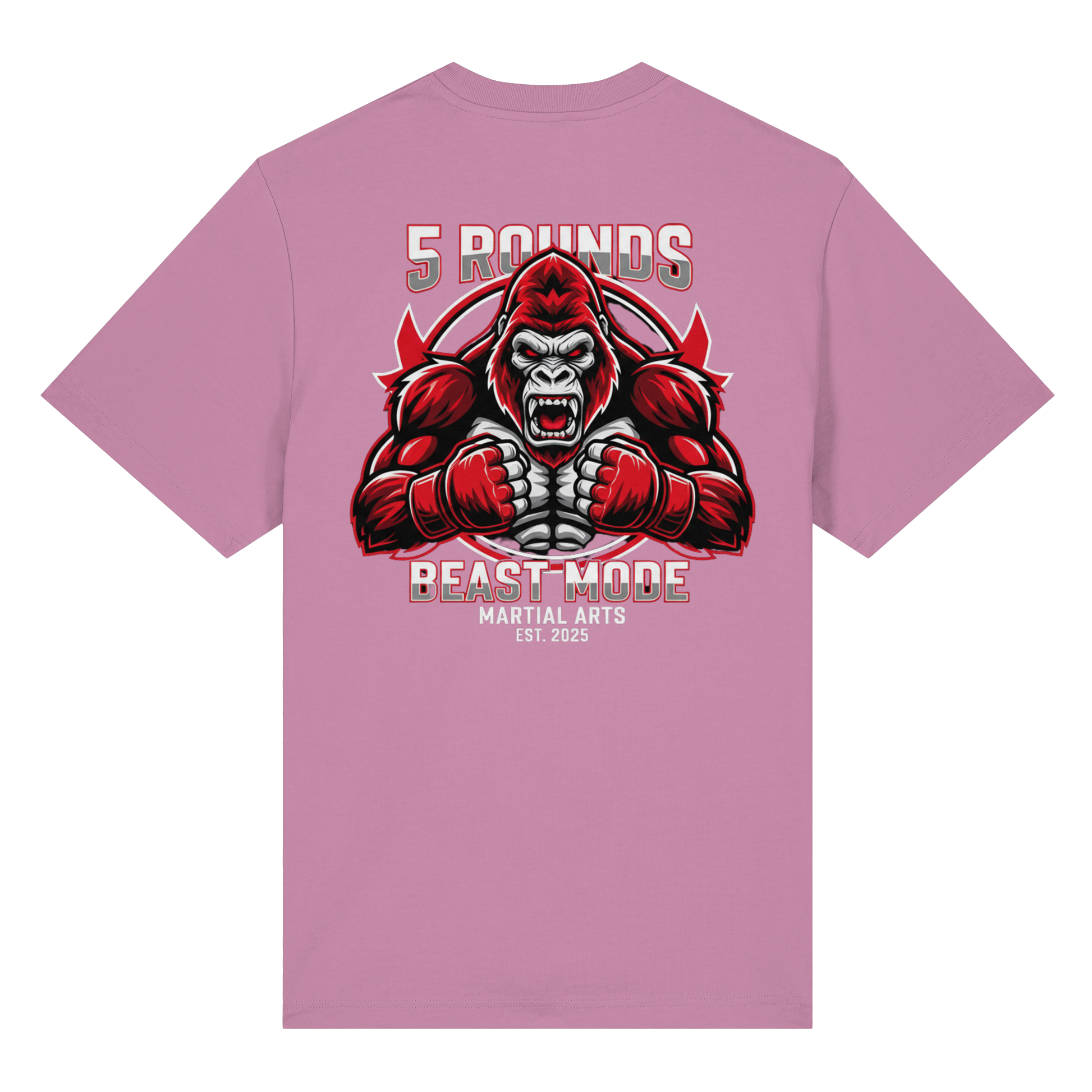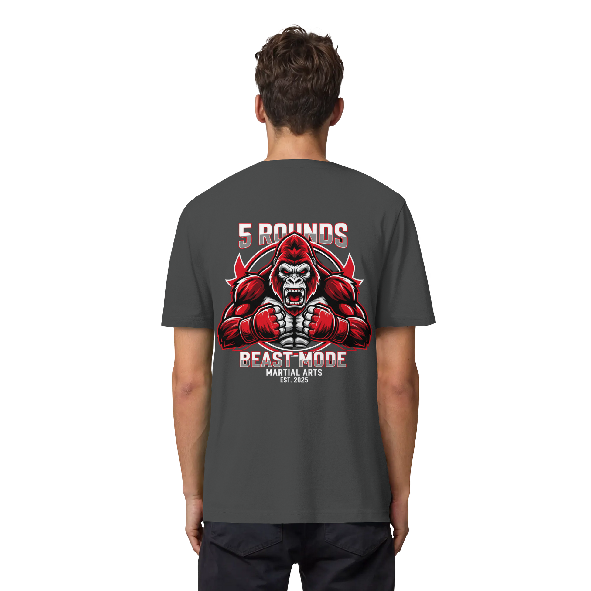 Erlebe das Gefühl von purer Kraft mit dem 5 ROUNDS BEAST MODE Gorilla Organic Heavy T-Shirt. Das kraftvolle BEAST MODE Gorilla-Motiv in Rot, Weiß und Schwarz – kleiner DTF-Druck vorne auf der Brust und großer DTF-Druck auf dem Rücken – symbolisiert unbändige Energie und Entschlossenheit. Premium Combat Sports Streetwear aus 100% Bio-Baumwolle für MMA, Kampfsport und Boxing.