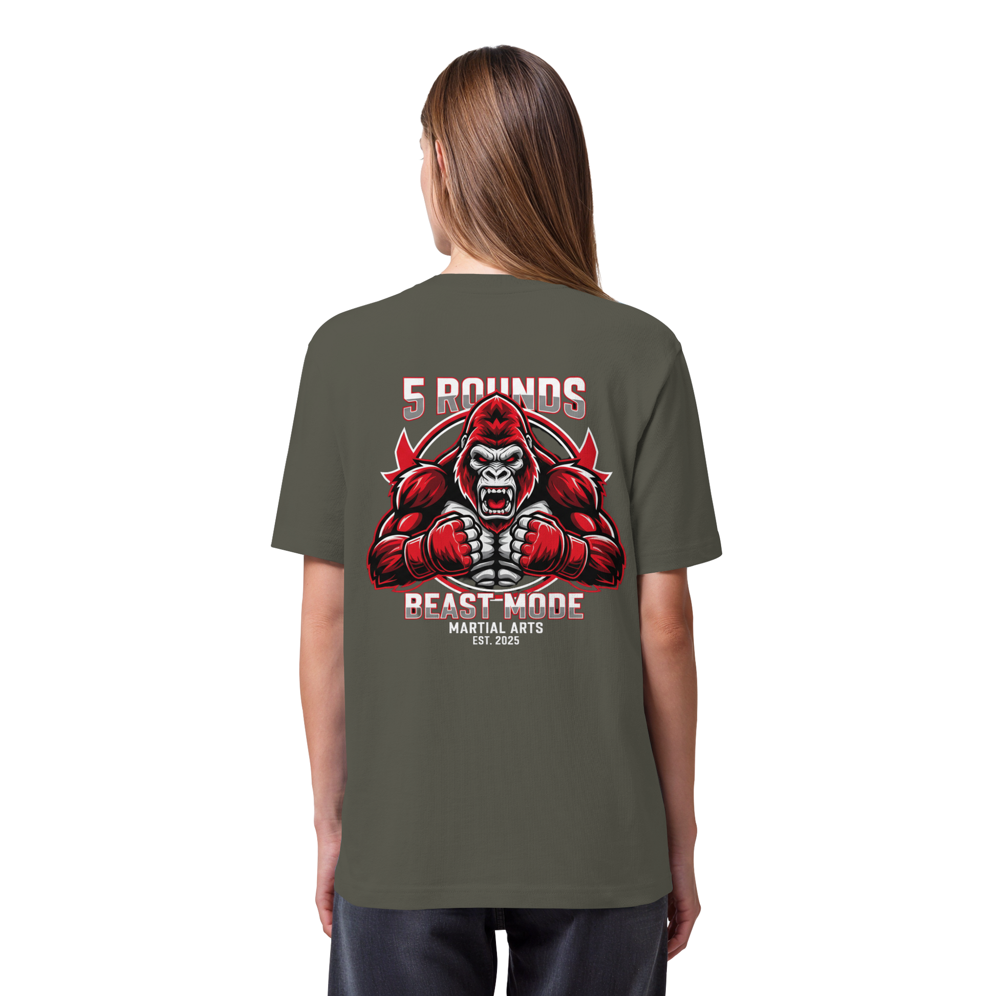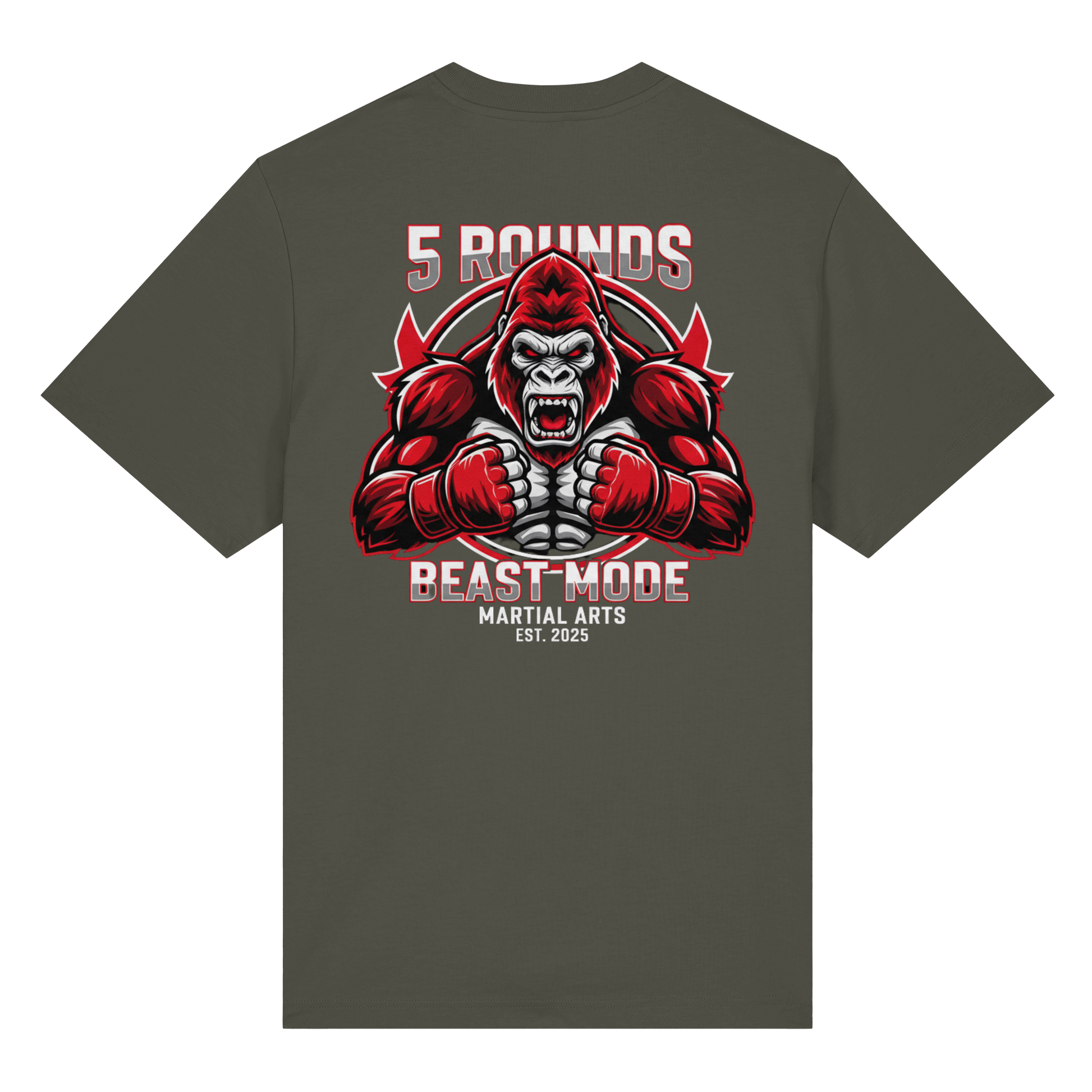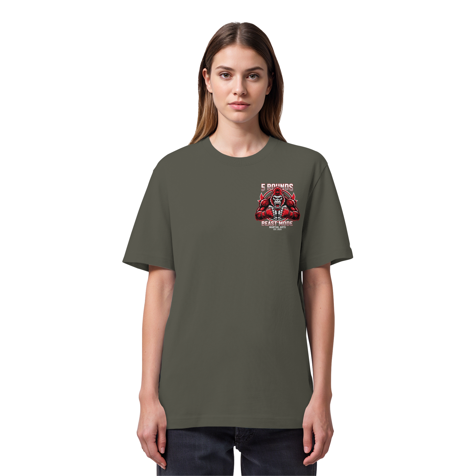 Dieses Premium 5 ROUNDS BEAST MODE Gorilla Organic Heavy T-Shirt vereint 100% Bio-Baumwolle mit kraftvollem Design. DTF-Druck vorne klein und hinten groß in Rot, Weiß, Schwarz. DTF ist das beste Druckverfahren für Baumwolle. Erhältlich in 7 Farben: Black, French Navy, Khaki, Anthracite, Bubble Pink, Nispero, Worker Blue. Jedes Stück wird individuell hergestellt. Lieferzeit: 5-7 Werktage. Ideal für MMA, Kampfsport und Combat Sports Streetwear.