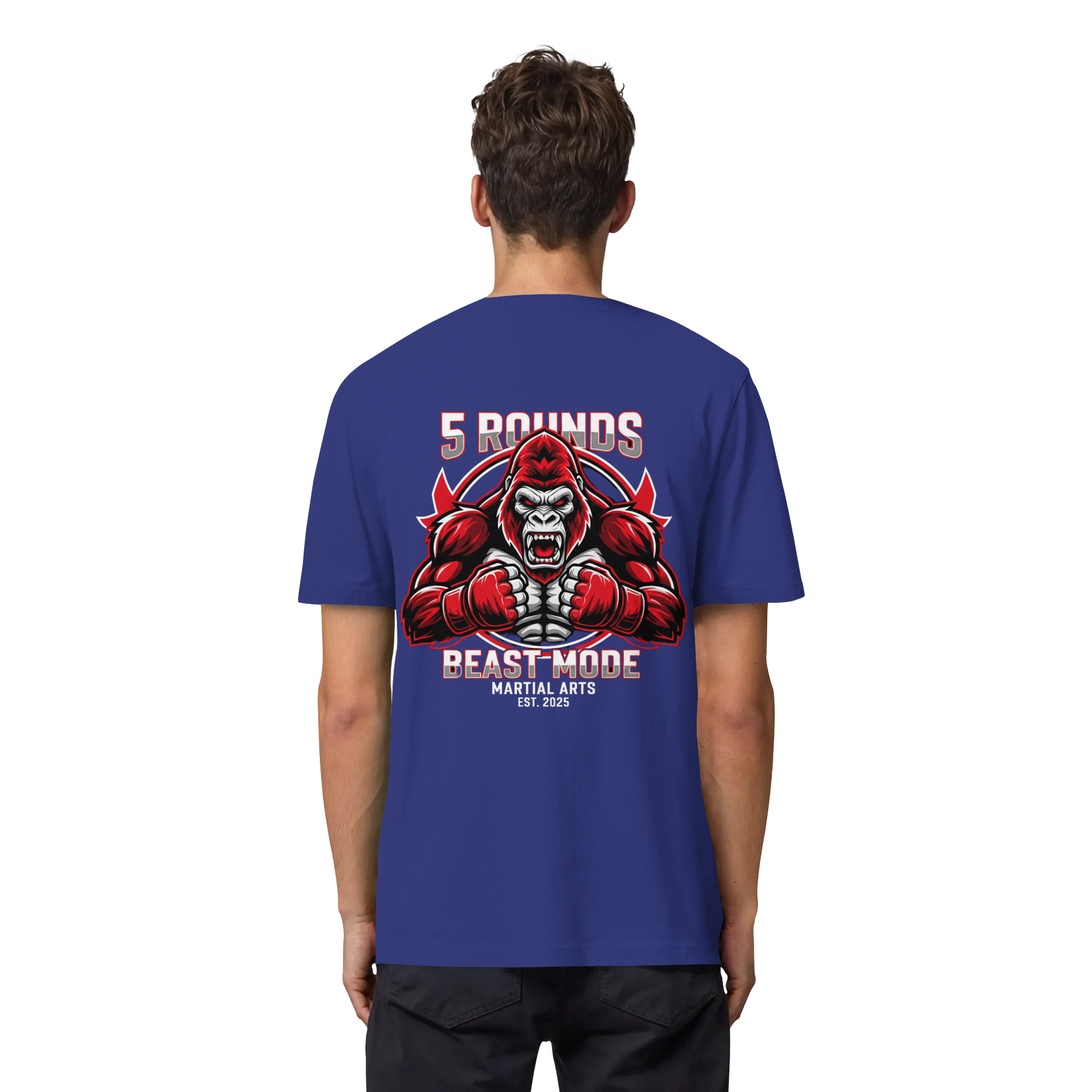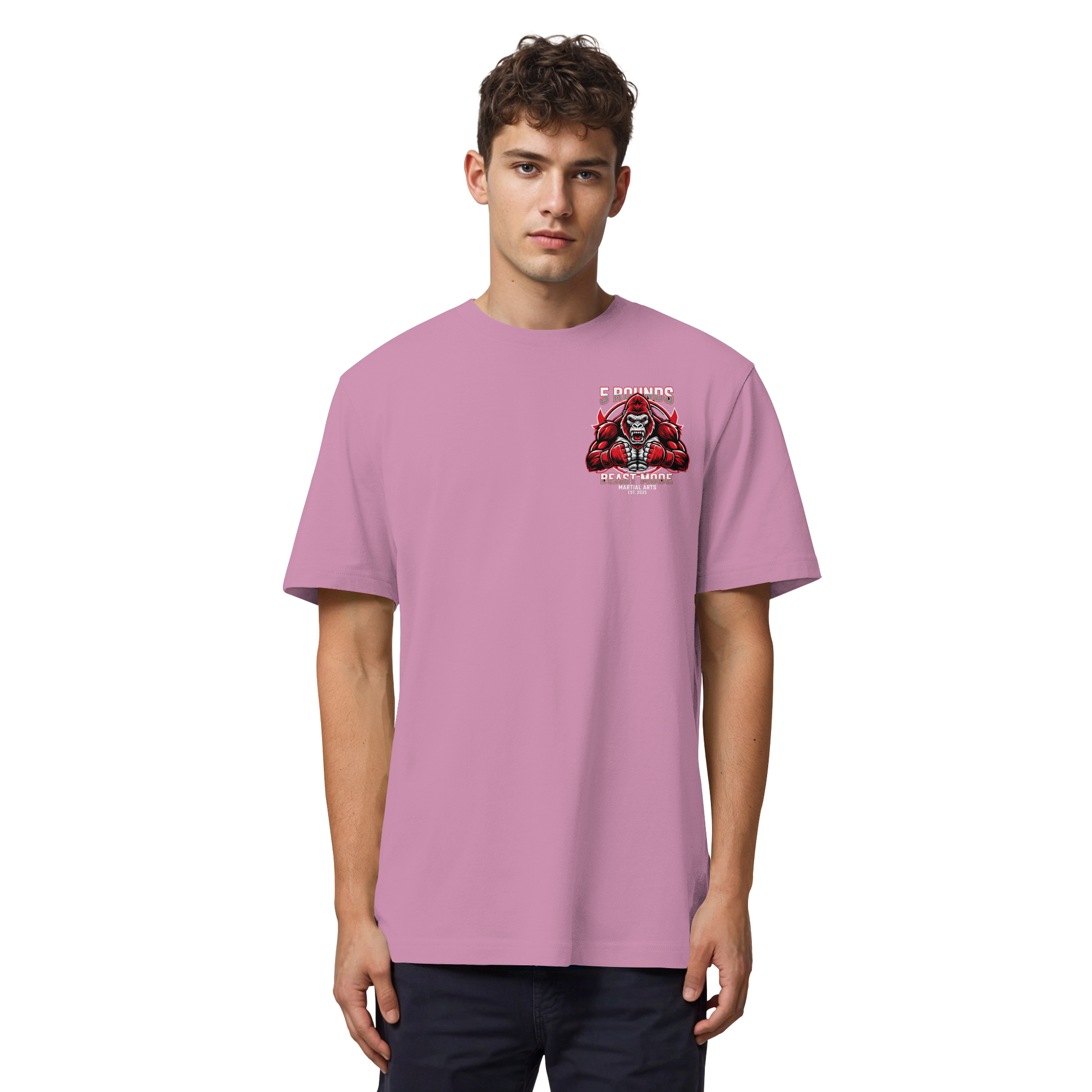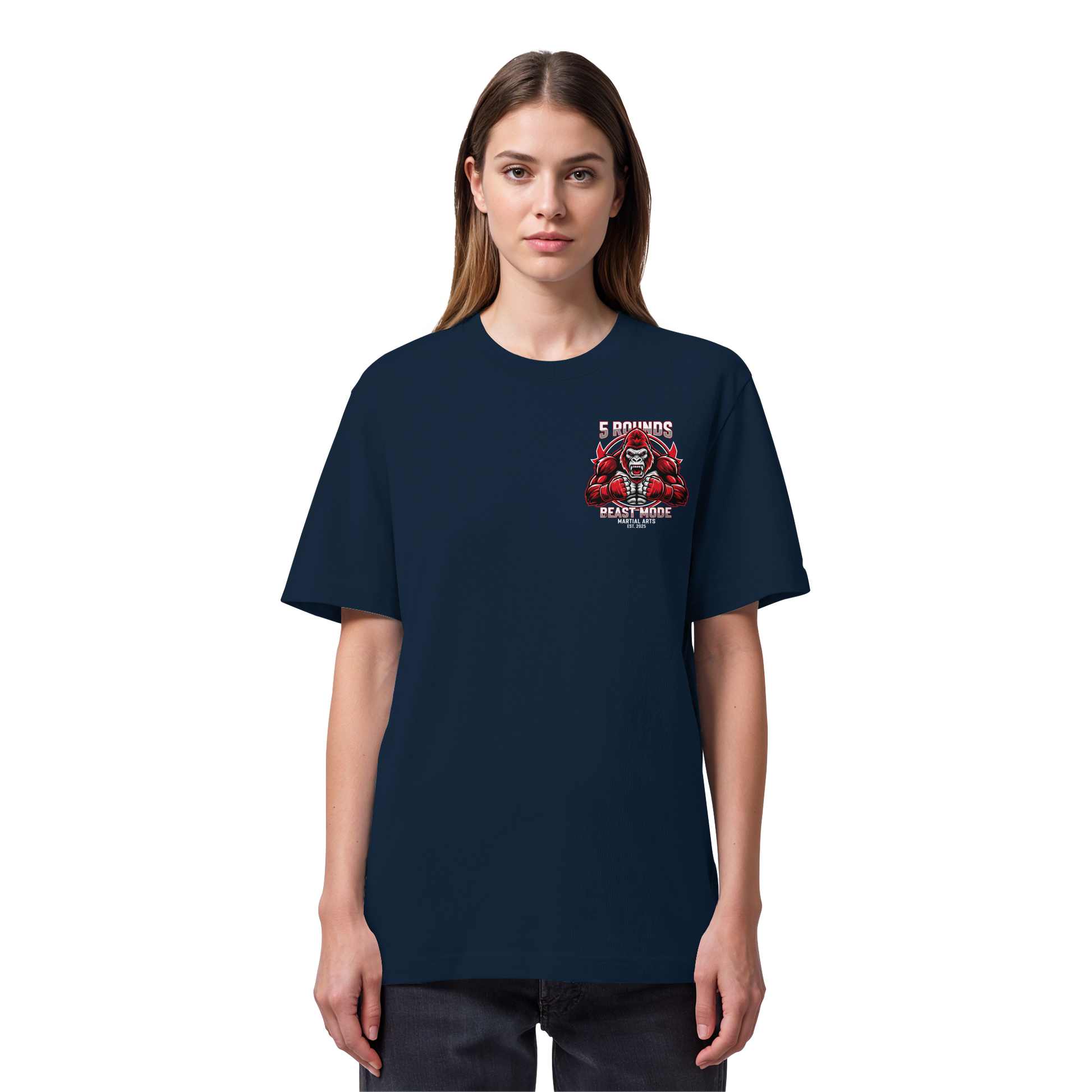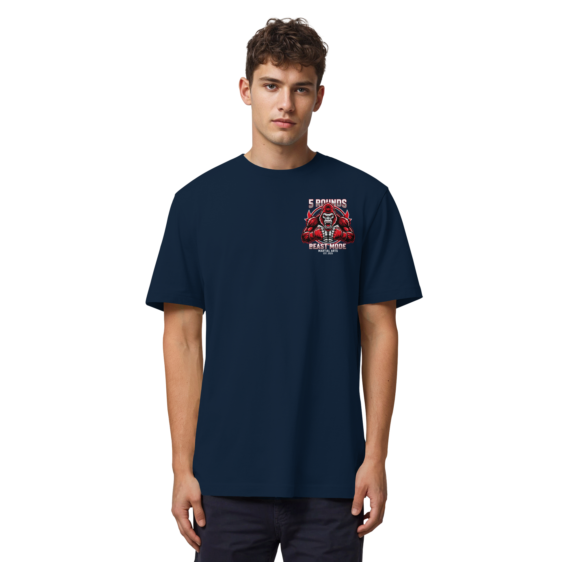 Dieses Premium 5 ROUNDS BEAST MODE Gorilla Organic Heavy T-Shirt vereint 100% Bio-Baumwolle mit kraftvollem Design. DTF-Druck vorne klein und hinten groß in Rot, Weiß, Schwarz. DTF ist das beste Druckverfahren für Baumwolle. Erhältlich in 7 Farben: Black, French Navy, Khaki, Anthracite, Bubble Pink, Nispero, Worker Blue. Jedes Stück wird individuell hergestellt. Lieferzeit: 5-7 Werktage. Ideal für MMA, Kampfsport und Combat Sports Streetwear.