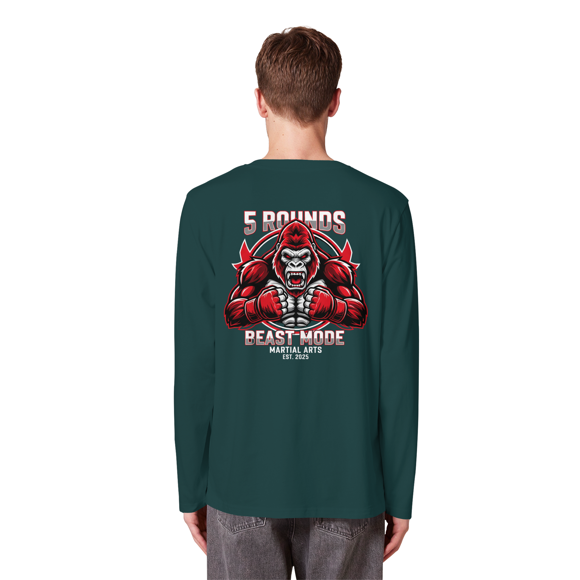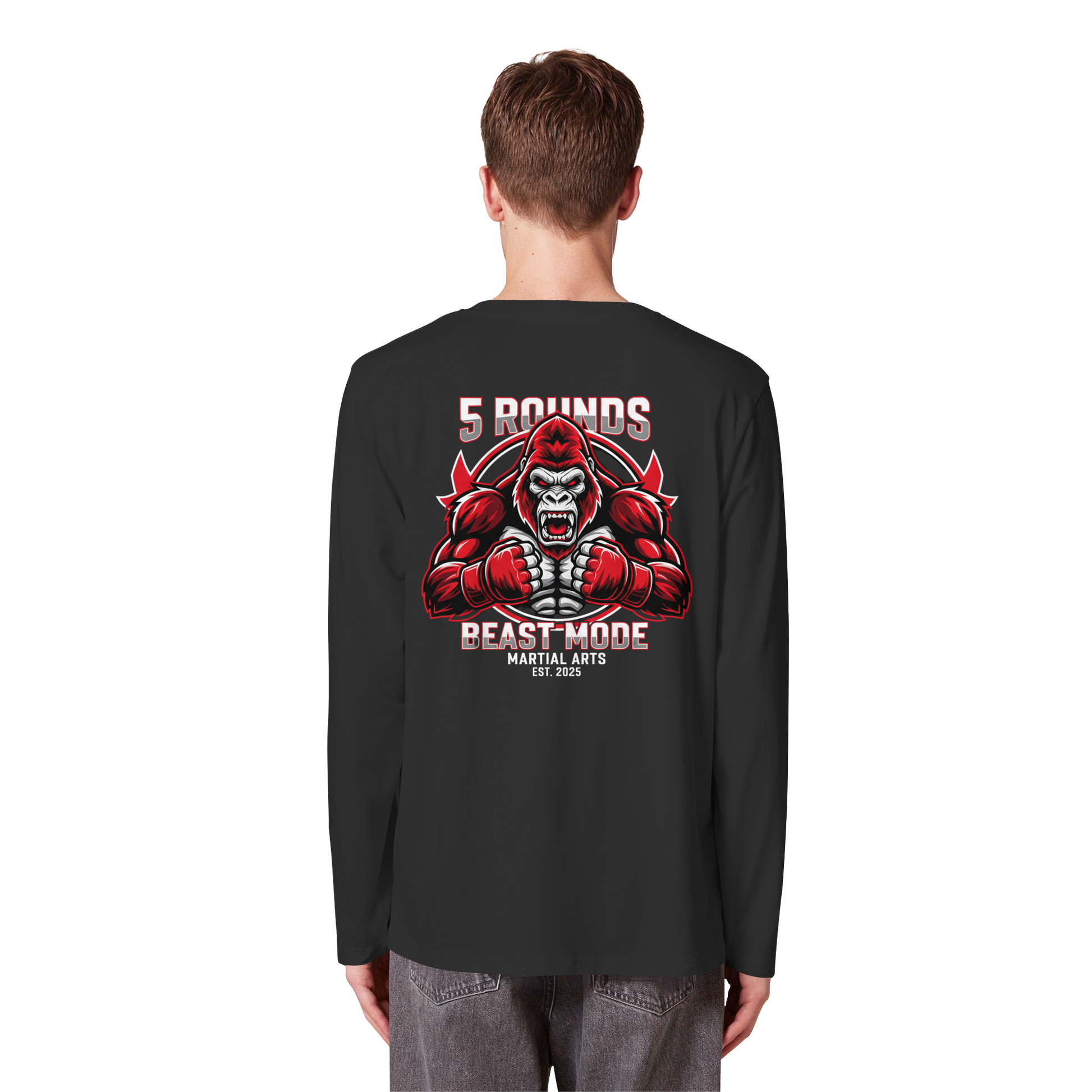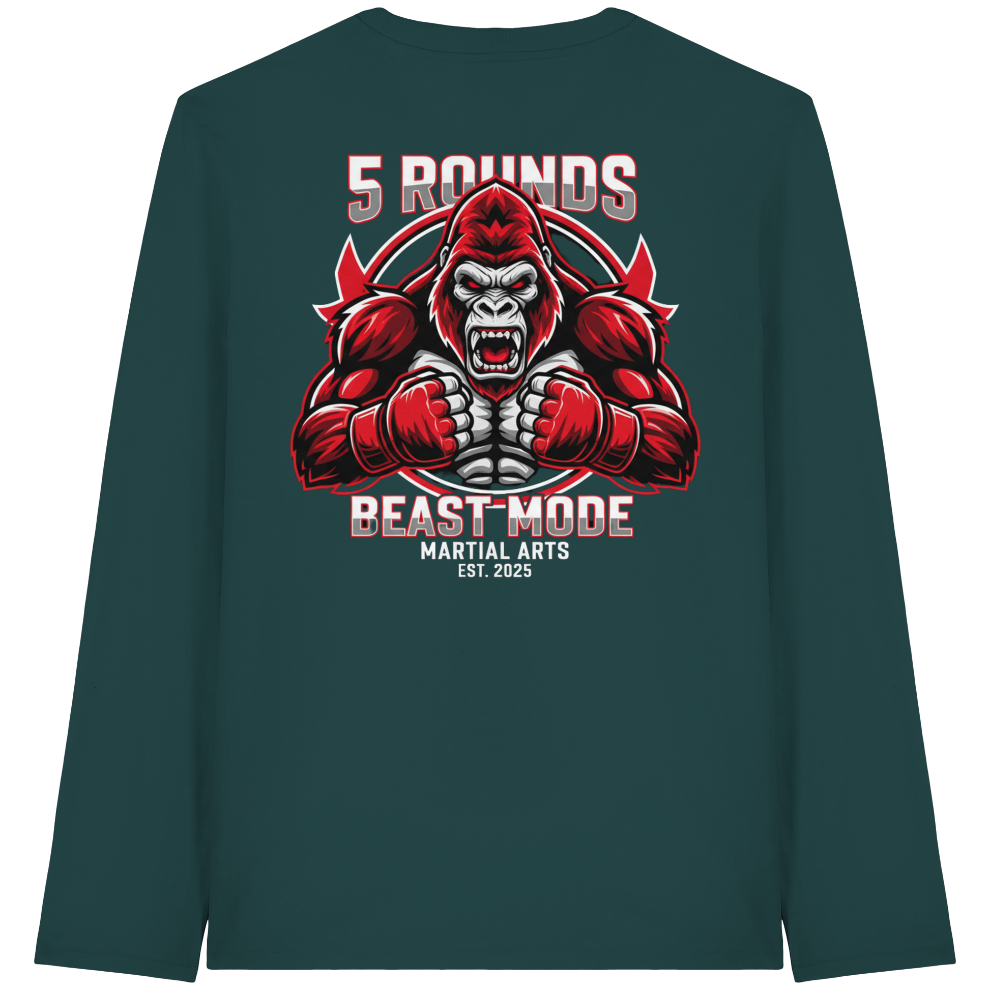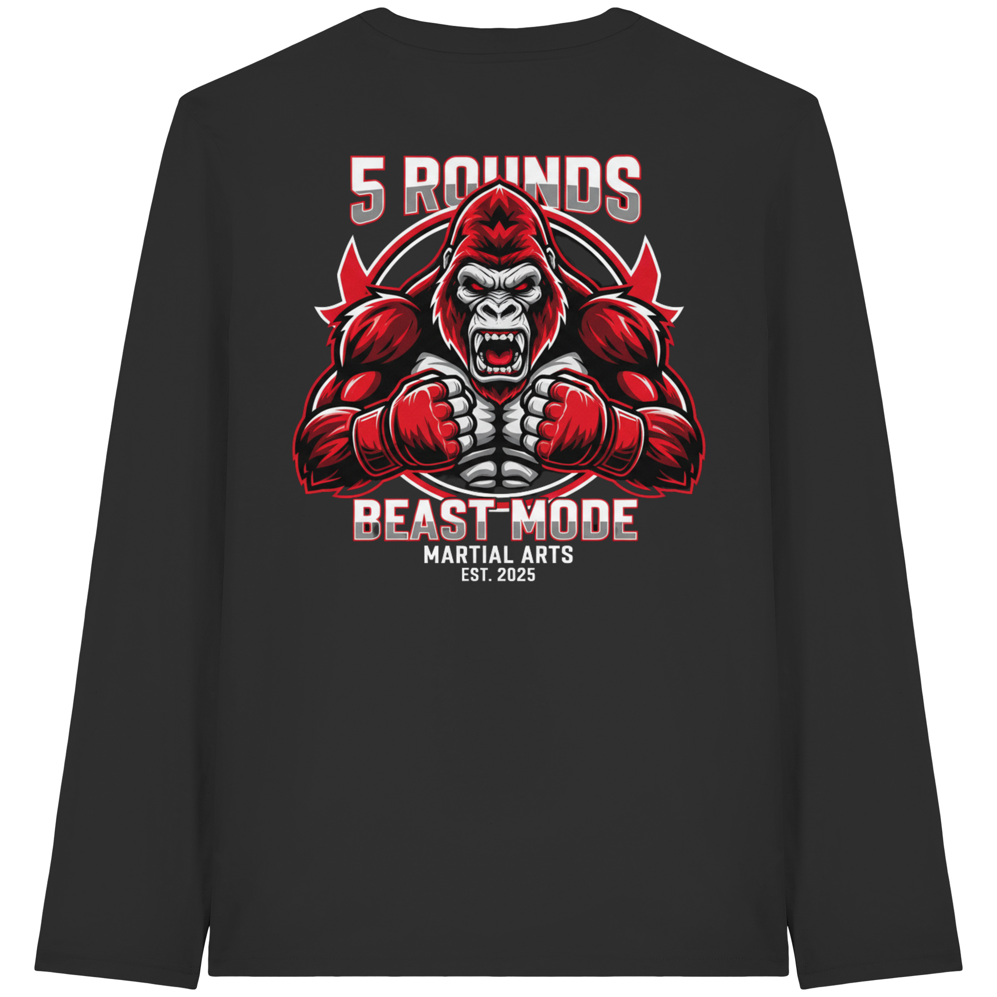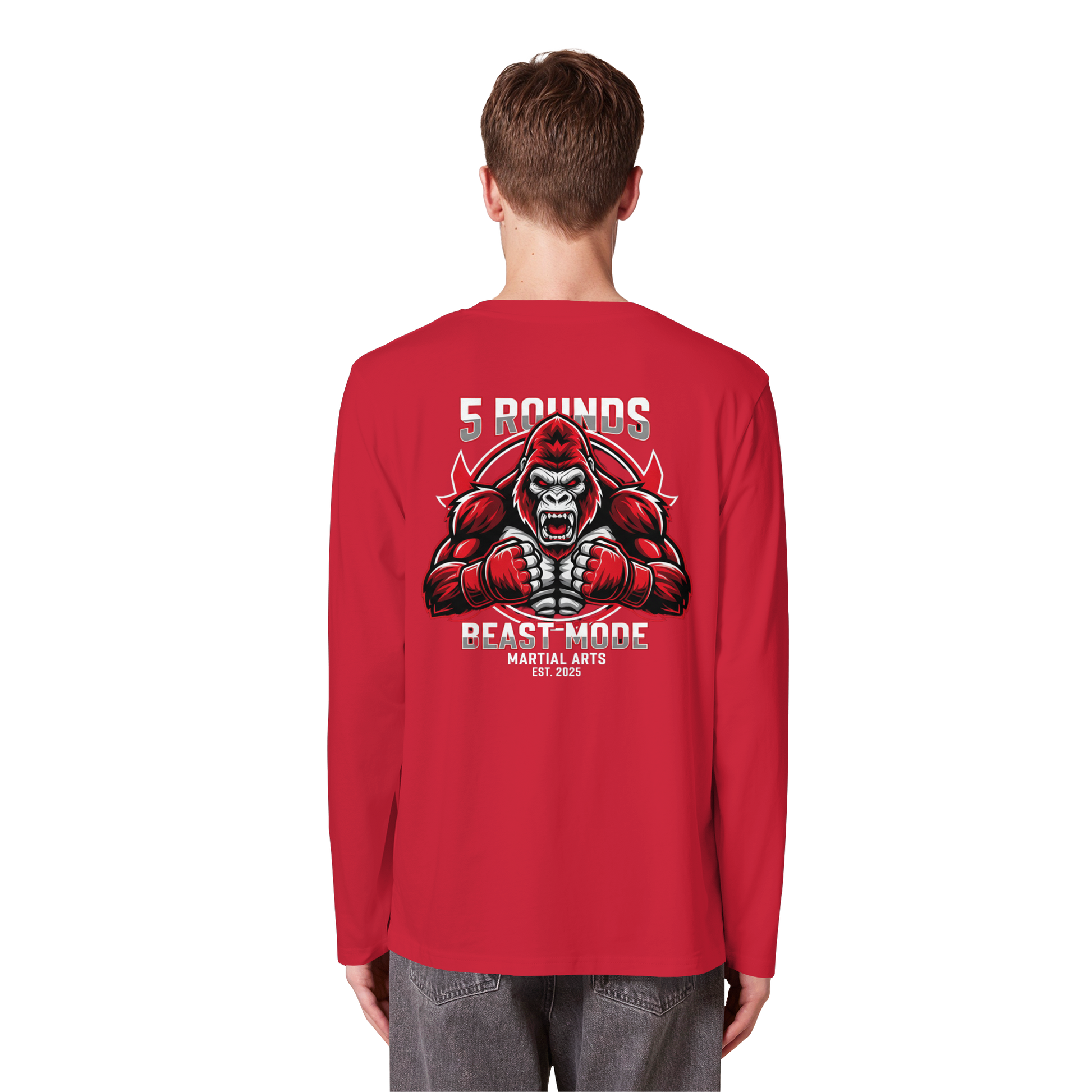 Mit dem 5 ROUNDS BEAST MODE Gorilla Motiv auf deinem Organic Longsleeve bist du bereit, jede Herausforderung anzunehmen. Der kraftvolle Gorilla DTF-Druck vorne und der große BEAST MODE Druck auf dem Rücken in Rot, Weiß und Schwarz symbolisieren Stärke und Unbesiegbarkeit. Premium Combat Sports Streetwear aus 100% Bio-Baumwolle für MMA, Kampfsport und Boxing.