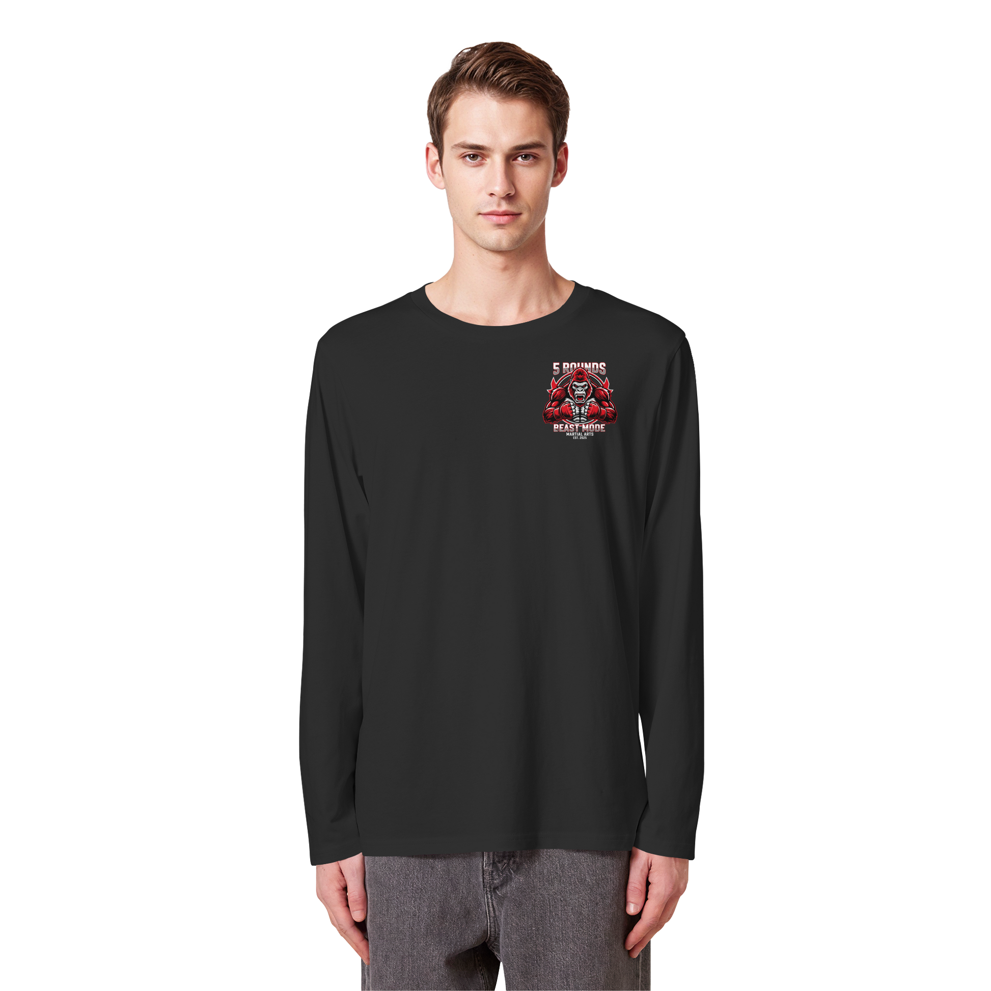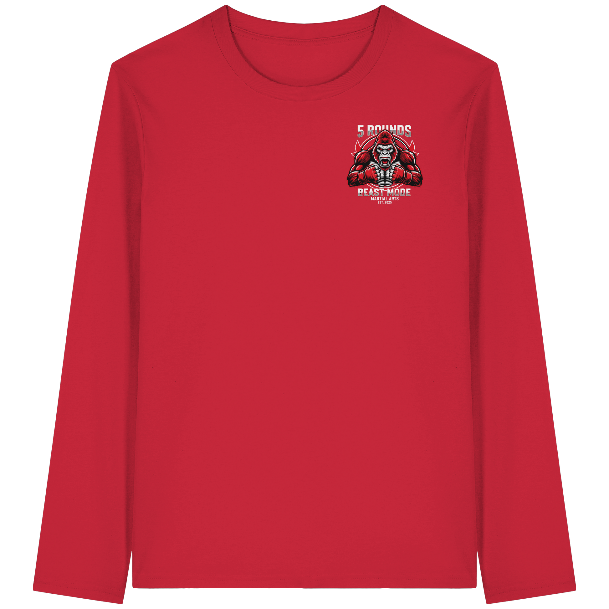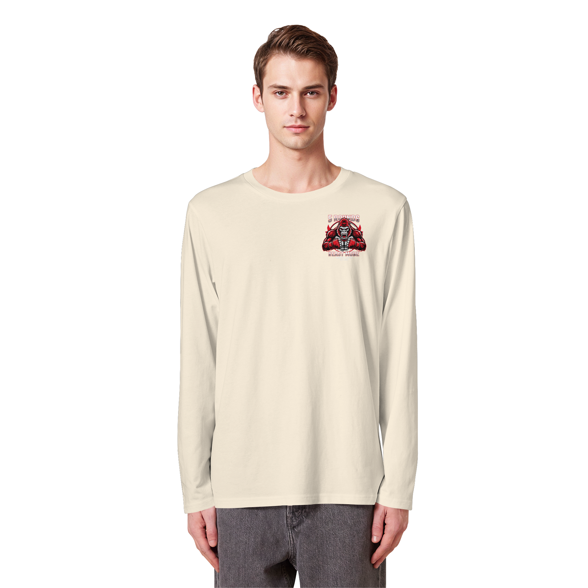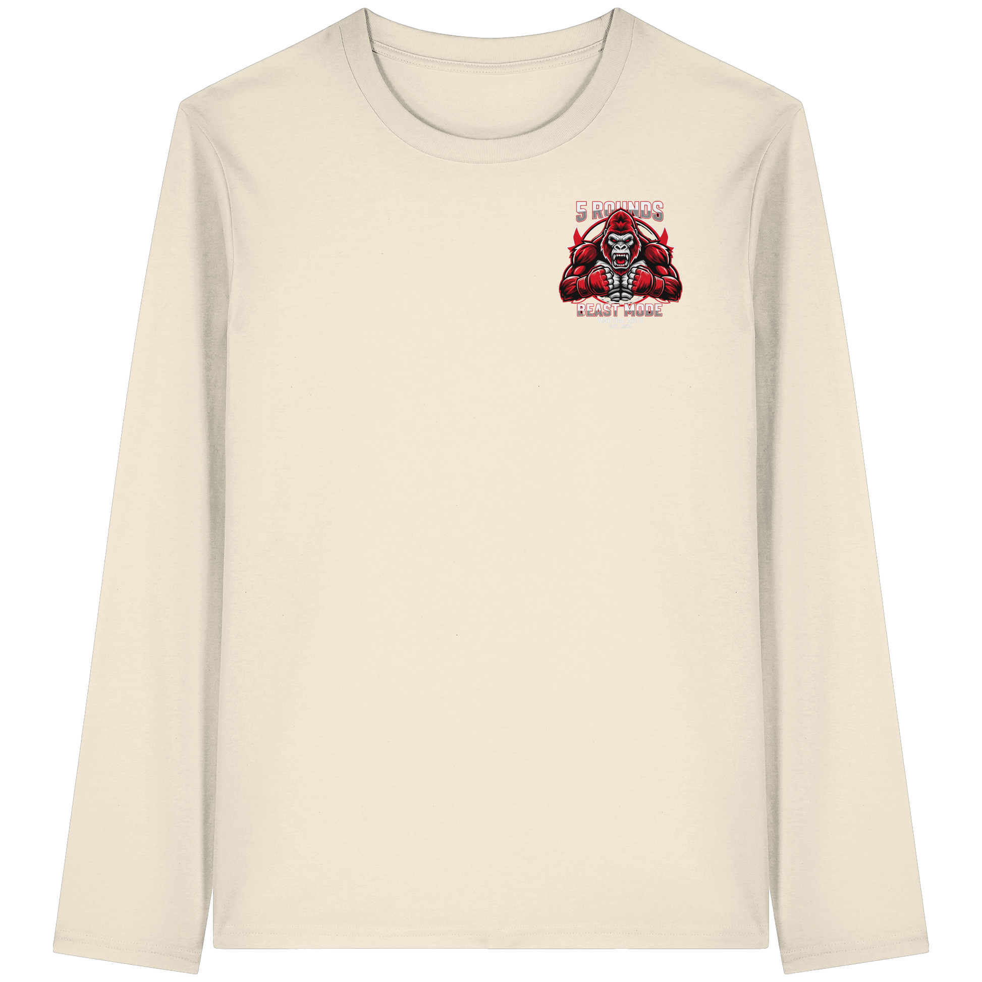 Mit dem 5 ROUNDS BEAST MODE Gorilla Motiv auf deinem Organic Longsleeve bist du bereit, jede Herausforderung anzunehmen. Der kraftvolle Gorilla DTF-Druck vorne und der große BEAST MODE Druck auf dem Rücken in Rot, Weiß und Schwarz symbolisieren Stärke und Unbesiegbarkeit. Premium Combat Sports Streetwear aus 100% Bio-Baumwolle für MMA, Kampfsport und Boxing.