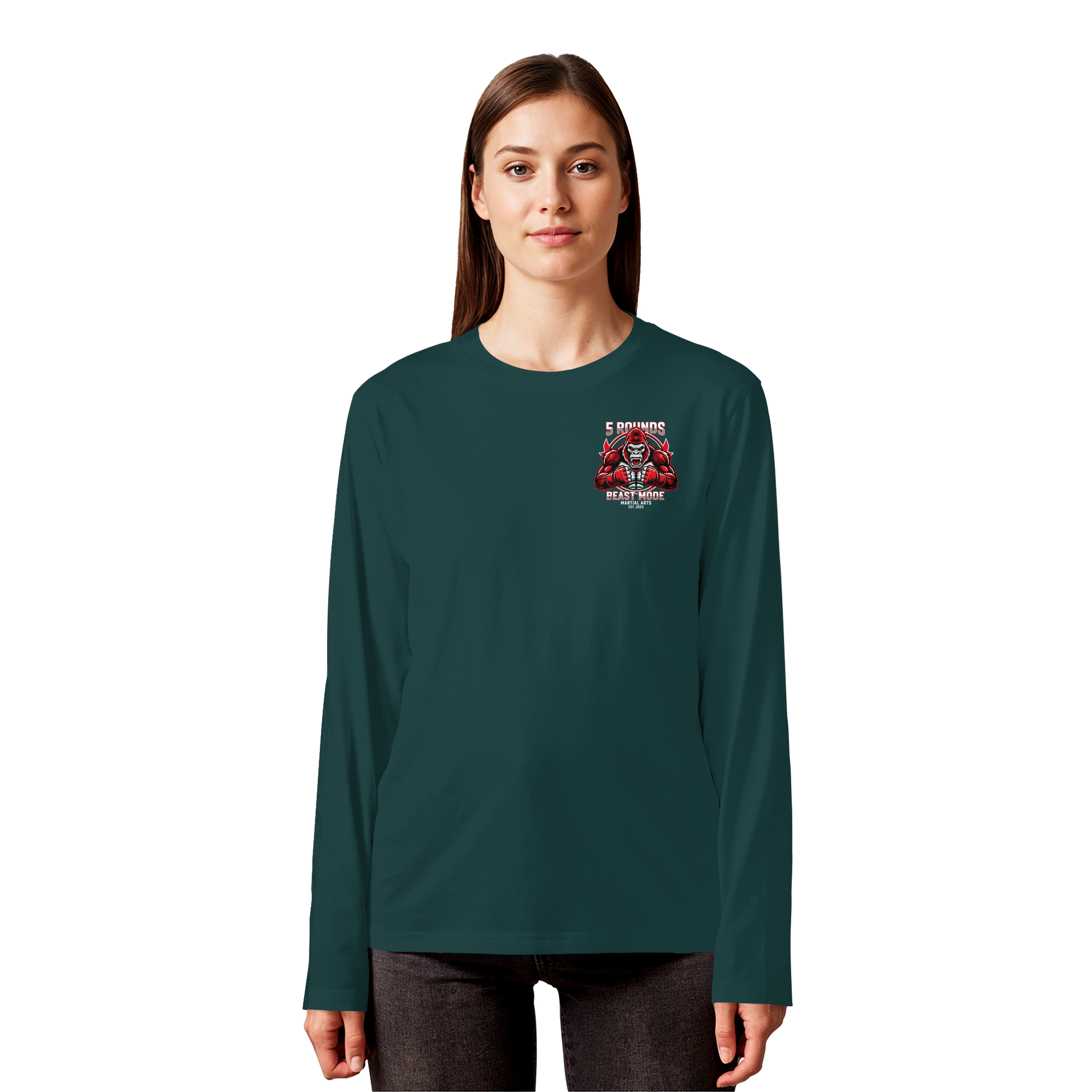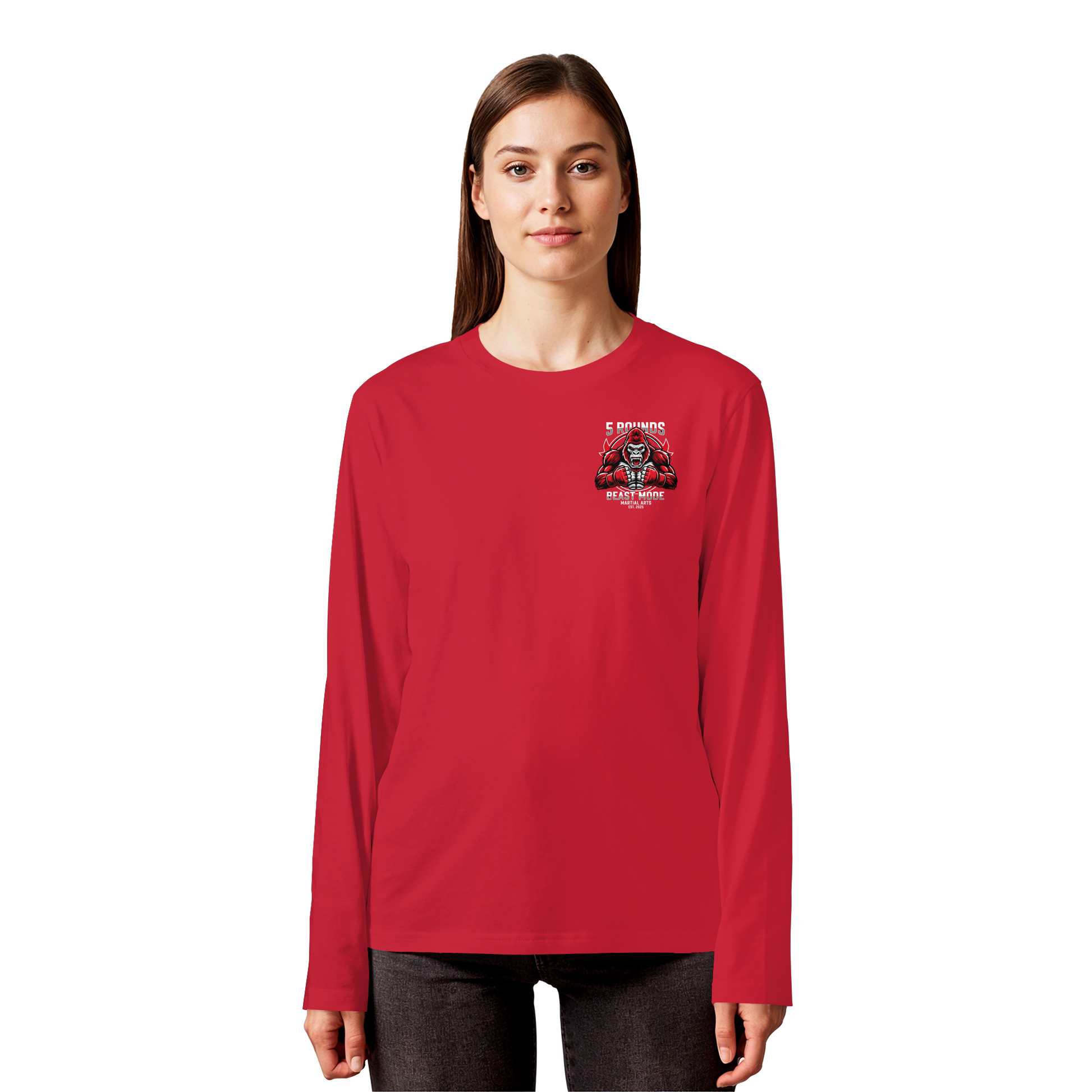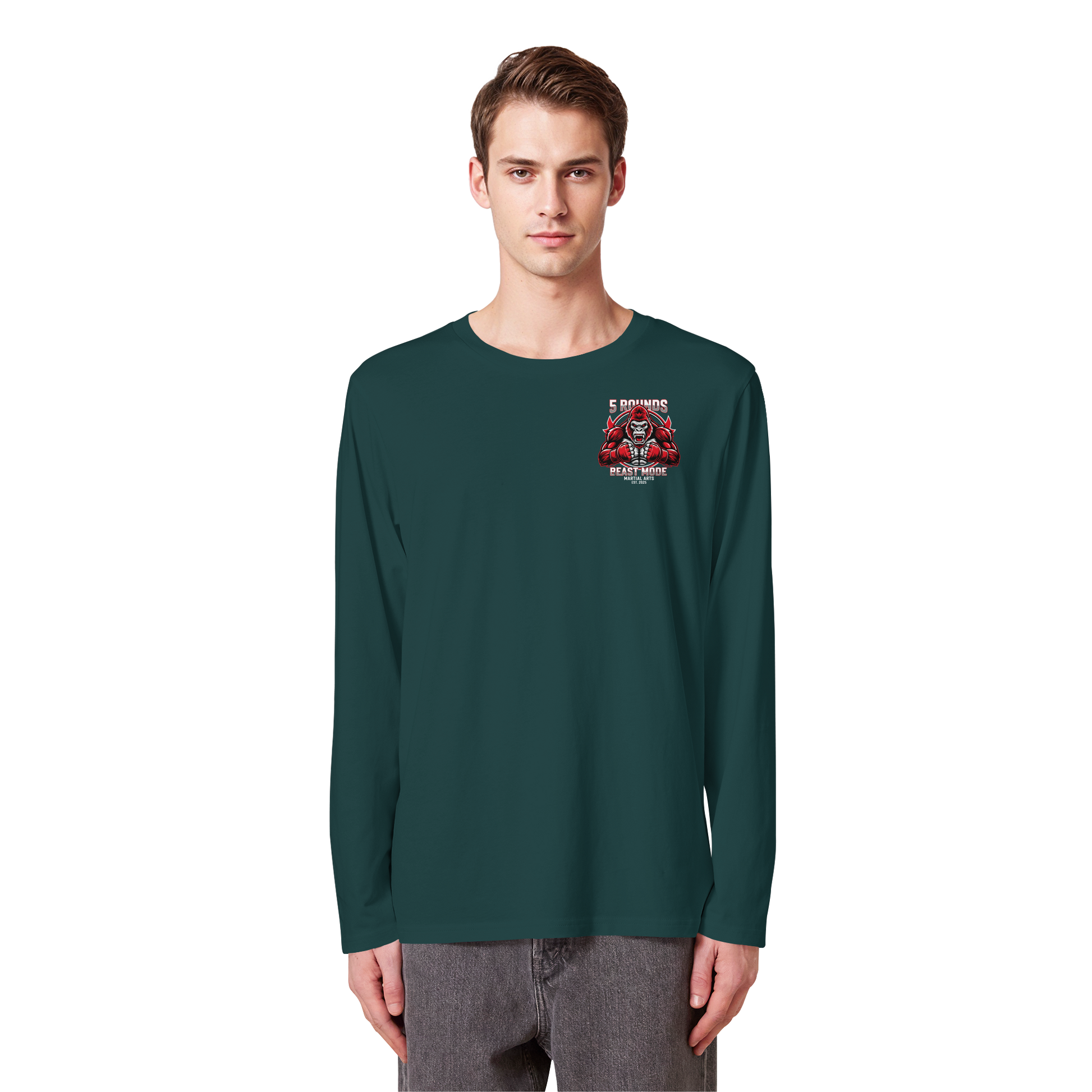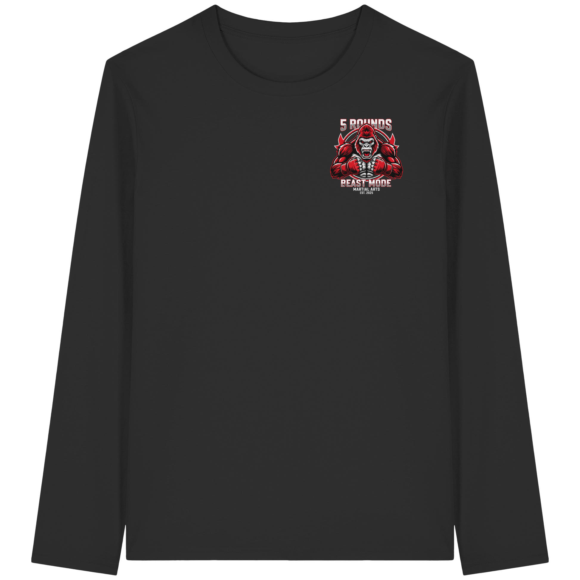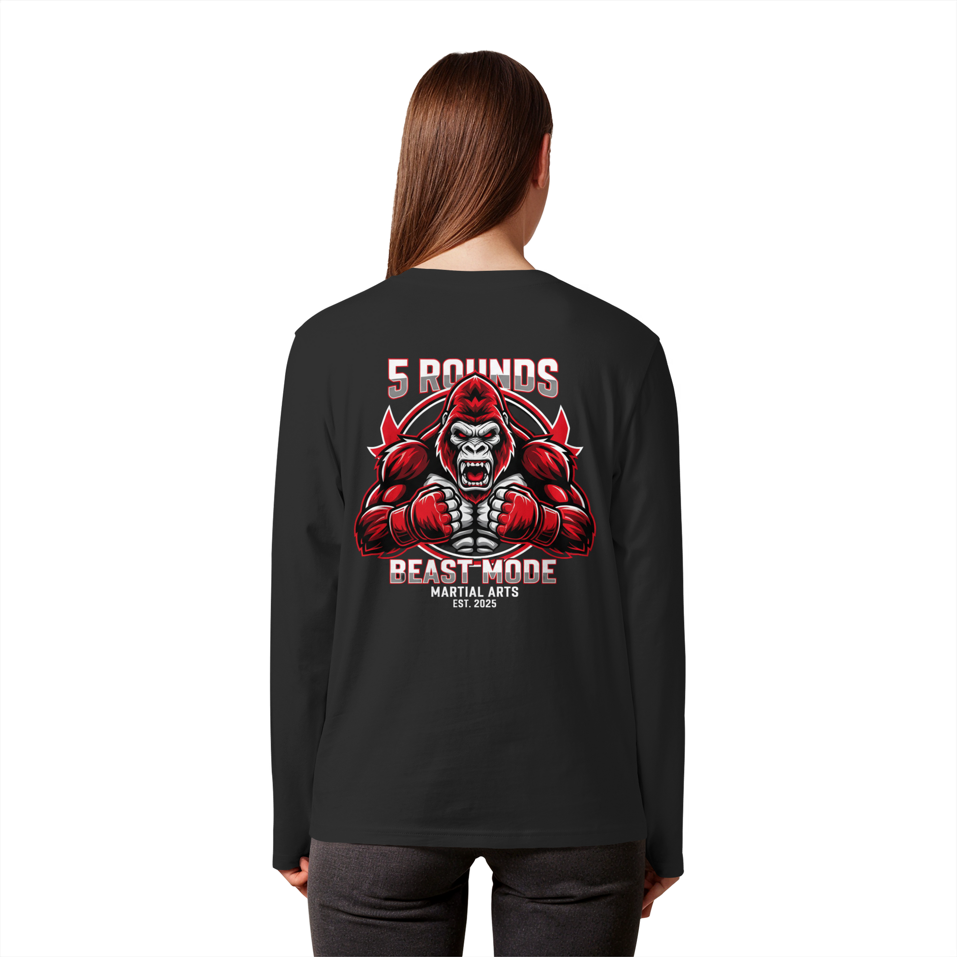 Mit dem 5 ROUNDS BEAST MODE Gorilla Motiv auf deinem Organic Longsleeve bist du bereit, jede Herausforderung anzunehmen. Der kraftvolle Gorilla DTF-Druck vorne und der große BEAST MODE Druck auf dem Rücken in Rot, Weiß und Schwarz symbolisieren Stärke und Unbesiegbarkeit. Premium Combat Sports Streetwear aus 100% Bio-Baumwolle für MMA, Kampfsport und Boxing.