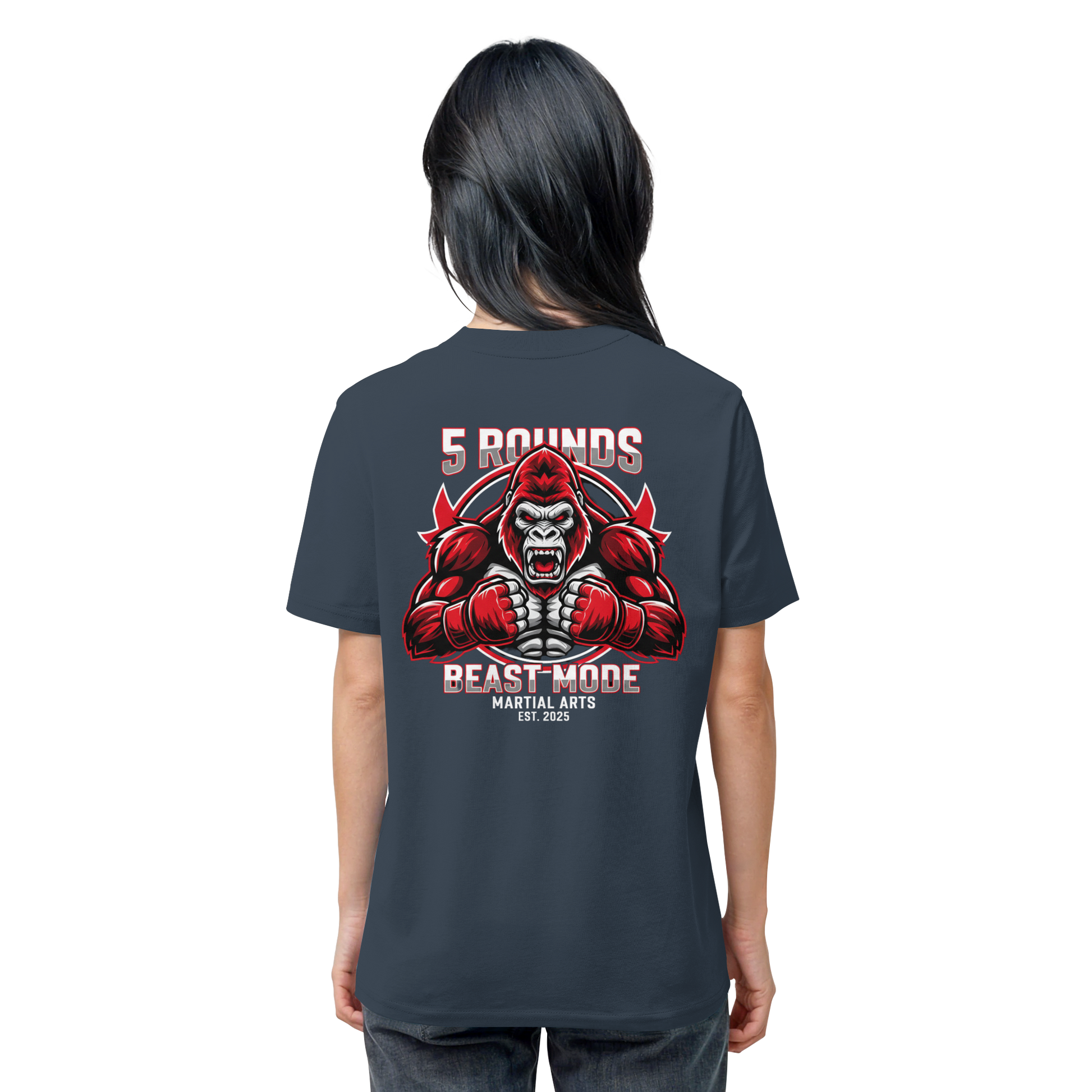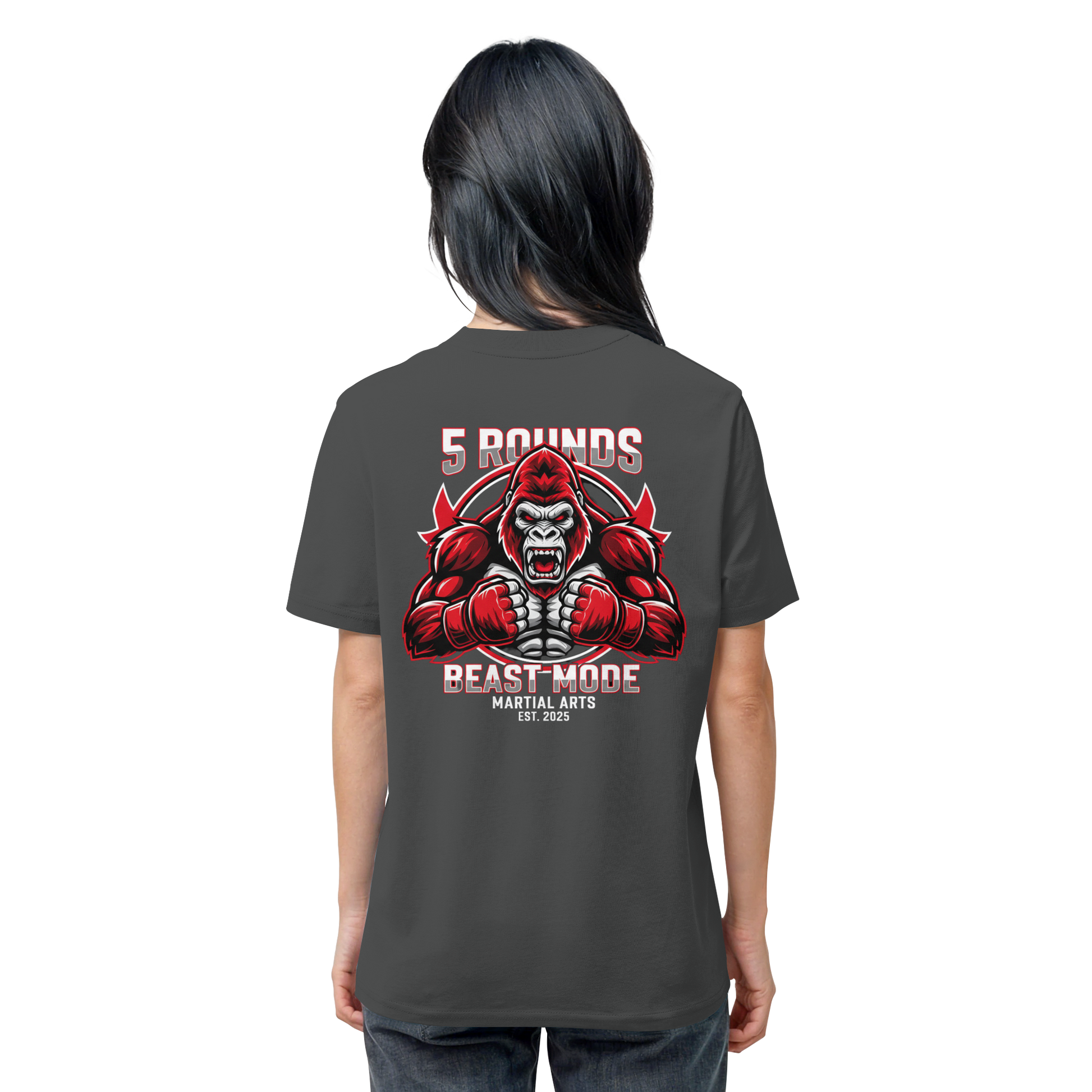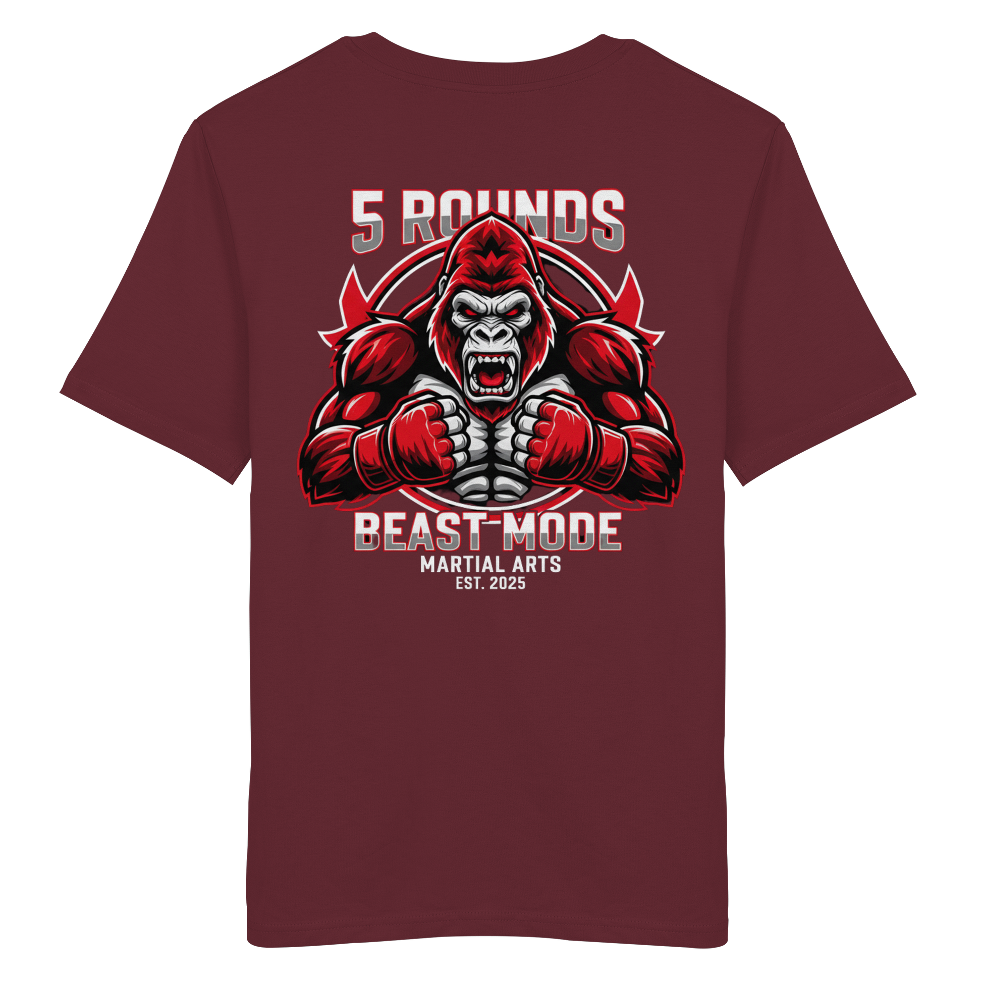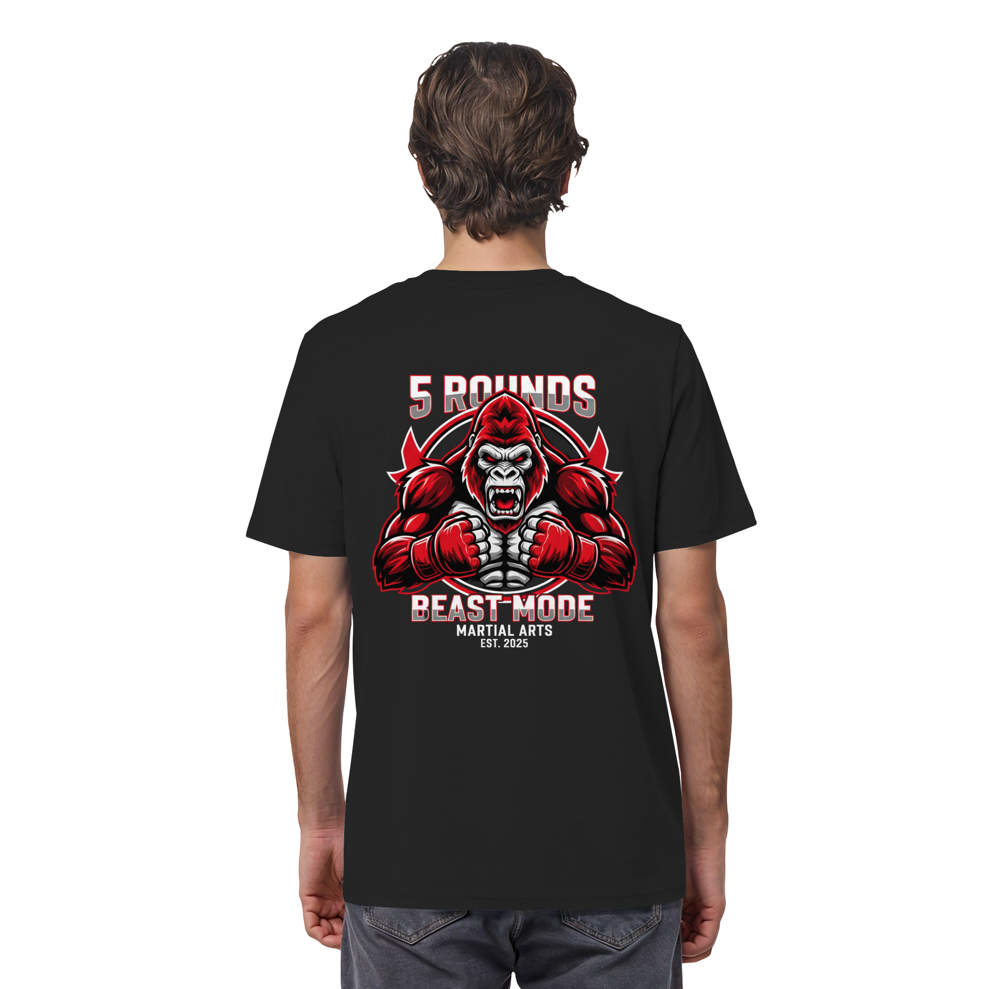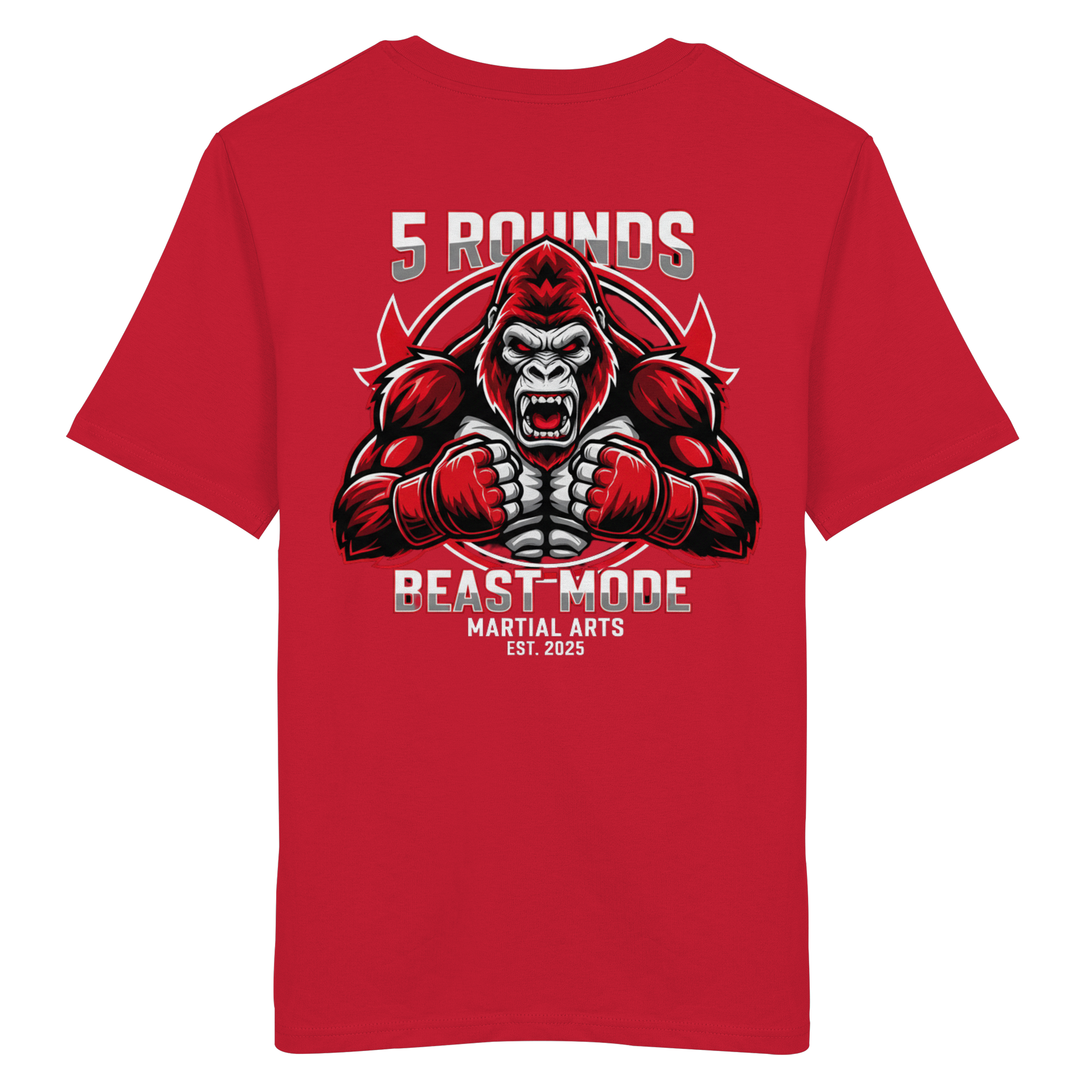 Erwecke den Kämpfer in dir! Das 5 ROUNDS BEAST MODE Gorilla Organic Shirt vereint kraftvolle Motive mit hochwertiger 100% Bio-Baumwolle. Der 5 ROUNDS Stick vorne auf der Brust und der kraftvolle BEAST MODE Gorilla DTF-Druck auf dem Rücken in Rot, Weiß und Schwarz symbolisieren Stärke und Entschlossenheit. Premium Combat Sports Streetwear für MMA, Kampfsport und Boxing.