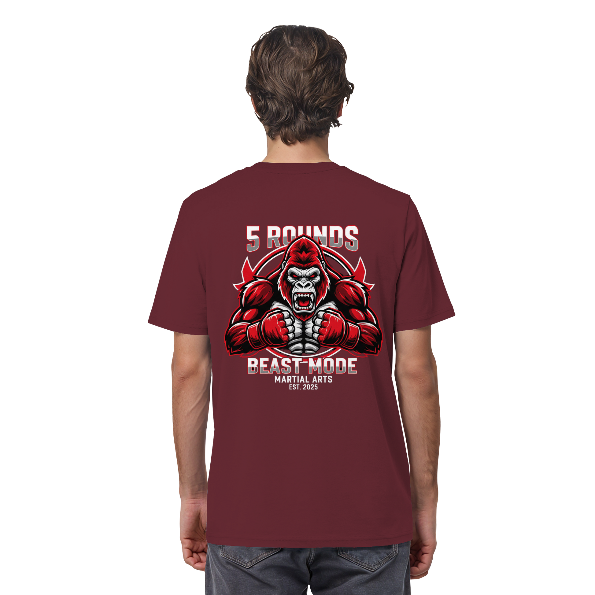 Dieses Premium 5 ROUNDS BEAST MODE Gorilla Organic Shirt vereint 100% Bio-Baumwolle mit kraftvollem Design. 5 ROUNDS Stick vorne und BEAST MODE Gorilla DTF-Druck hinten groß in Rot, Weiß, Schwarz. DTF ist das beste Druckverfahren für Baumwolle. Erhältlich in 6 Farben: Burgundy, Black, French Navy, Red, Khaki, Worker Blue. Jedes Stück wird individuell hergestellt. Lieferzeit: 5-7 Werktage. Ideal für MMA, Kampfsport und Combat Sports Streetwear.