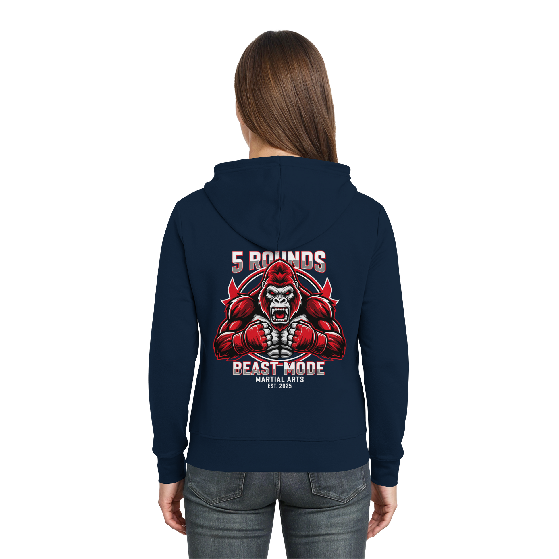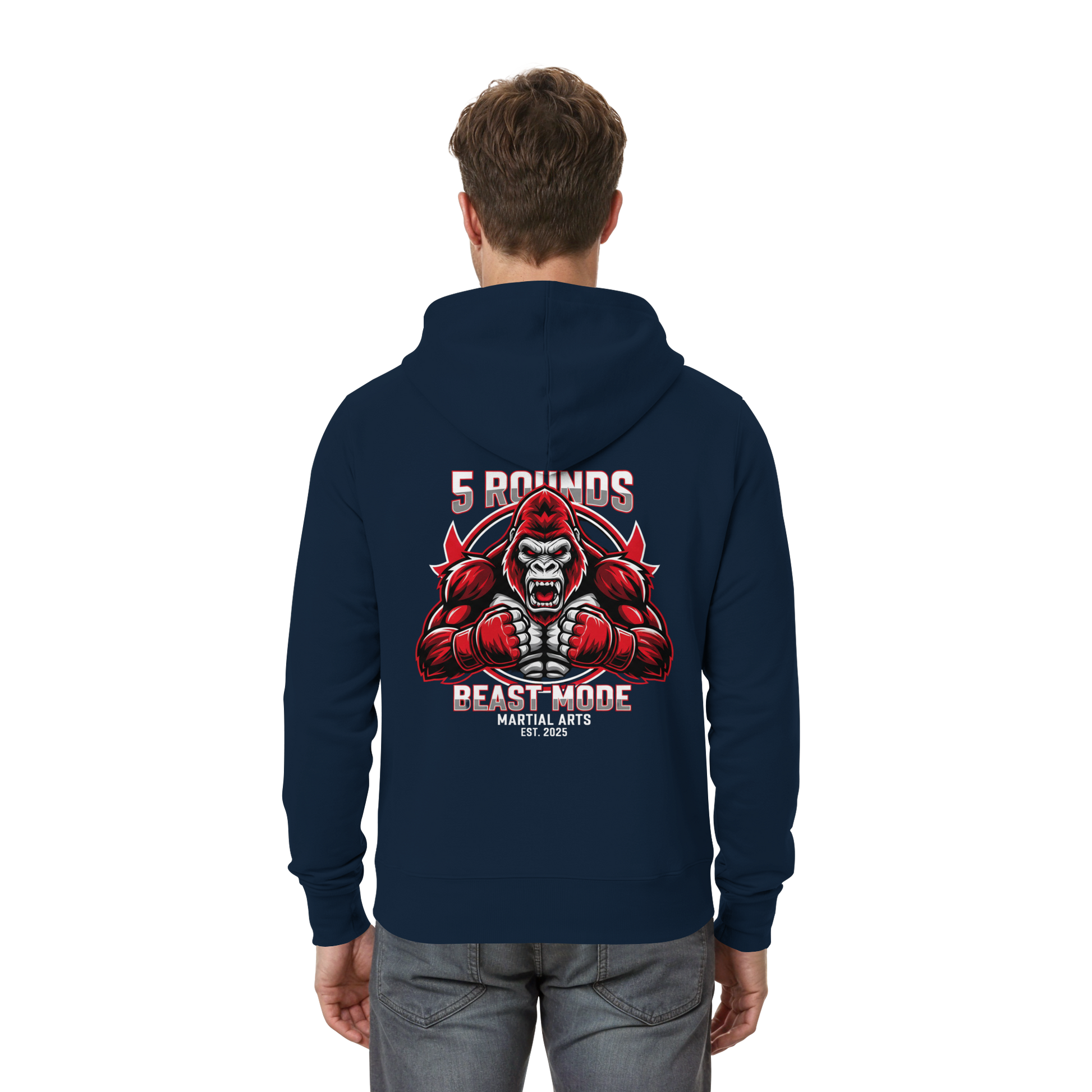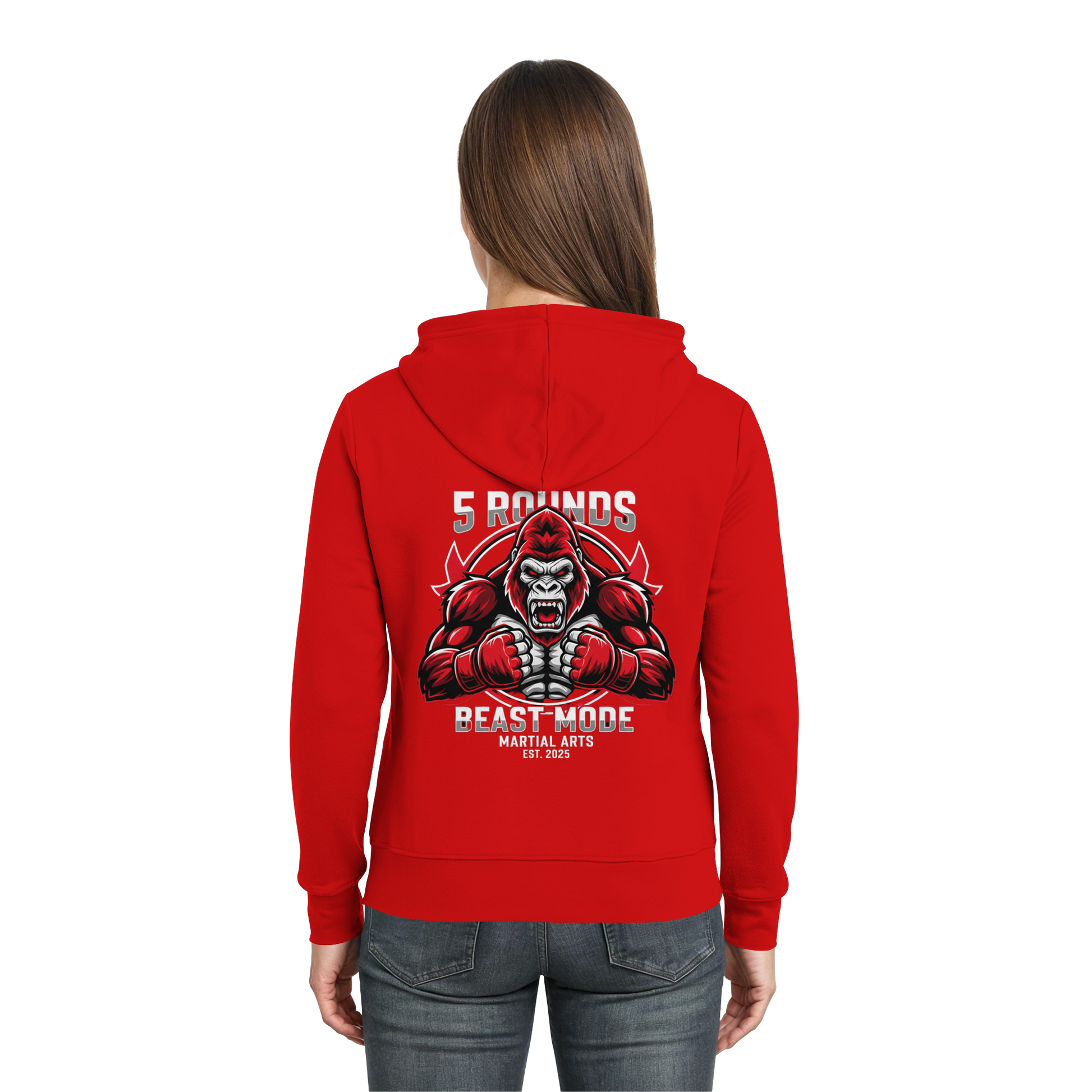 Entfessle den Kämpfer in dir! Der limitierte 5 ROUNDS BEAST MODE Gorilla Zipper ist mehr als nur ein Sweatshirt. Mit dem 5 ROUNDS Front-Stick und dem kraftvollen BEAST MODE Gorilla DTF-Druck auf dem Rücken in Rot, Weiß und Schwarz setzt er ein starkes Statement für alle, die keine Angst haben, an ihre Grenzen zu gehen. Premium Combat Sports Streetwear für MMA, Kampfsport und Boxing.