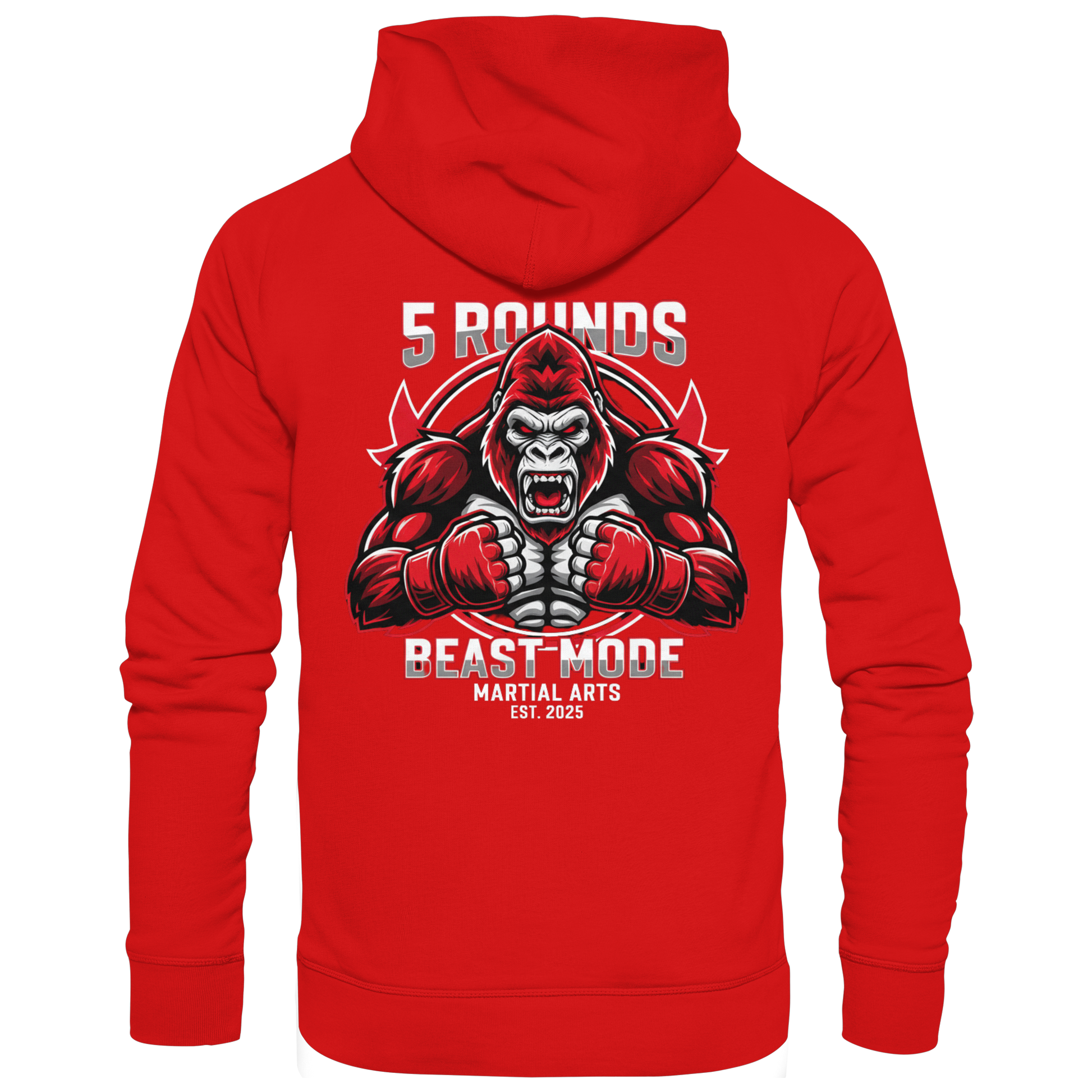 Das BEAST MODE Gorilla-Motiv auf dem Rücken symbolisiert Kraft und Entschlossenheit. Die prägnanten Farben Rot, Weiß und Schwarz verstärken das Gefühl von Energie und Leidenschaft. Vorne auf der Brust der hochwertige 5 ROUNDS Stick – cleanes Branding für echte Fighter.