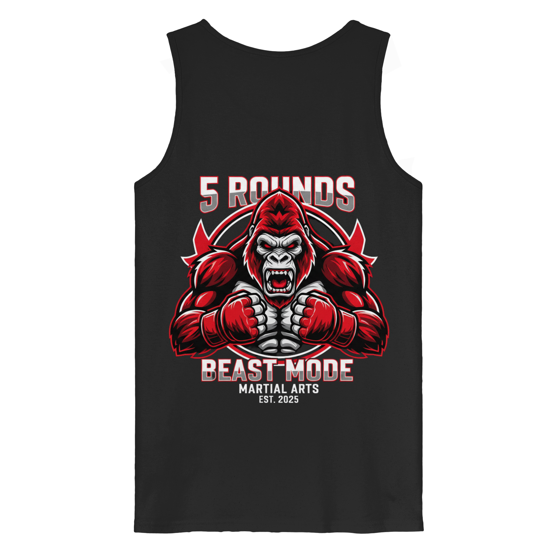 Premium MMA Tank Top mit BEAST MODE Gorilla Design in Rot, Weiß und Schwarz. DTF-Druck klein vorne, sehr großer Rücken-Print. Ideal für Kampfsport und Streetwear.