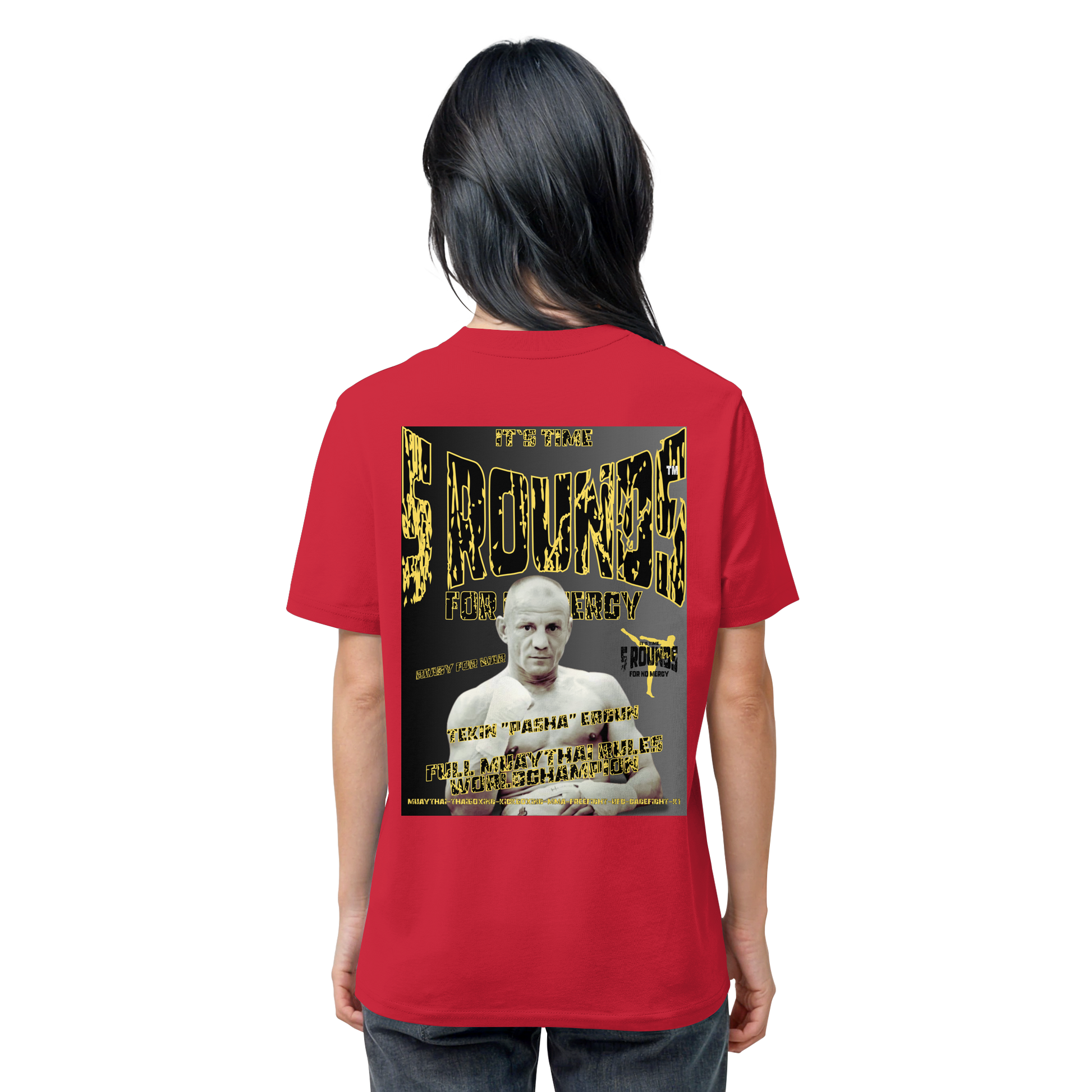 Dieses Shirt ist mehr als nur ein Kleidungsstück – es ist ein Statement. Rot wie das Feuer in dir, Bio wie dein Anspruch an Qualität, und mit dem Tekin "PASHA" Ergun Motiv auf dem Rücken trägst du ein Stück Kampfsport-Geschichte.