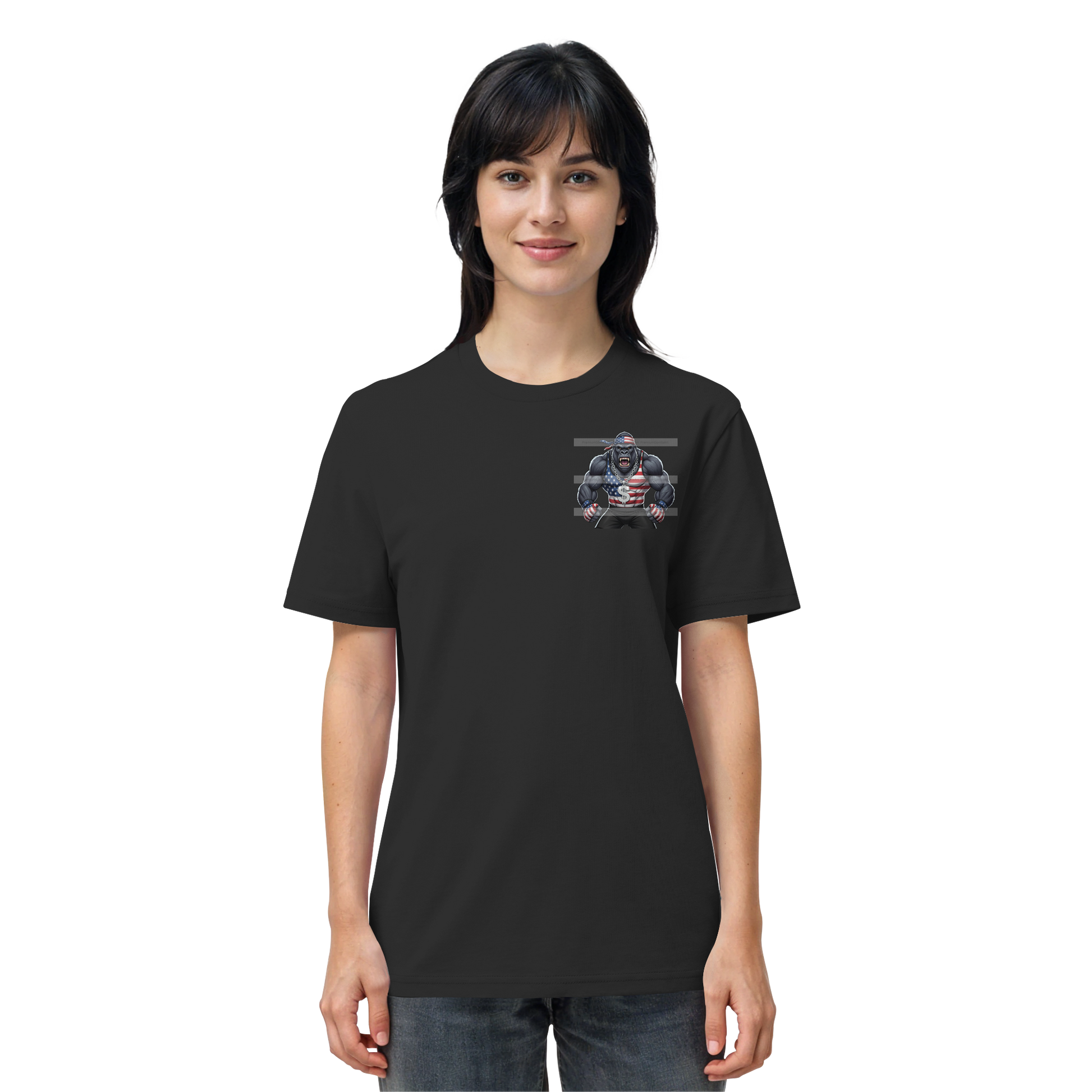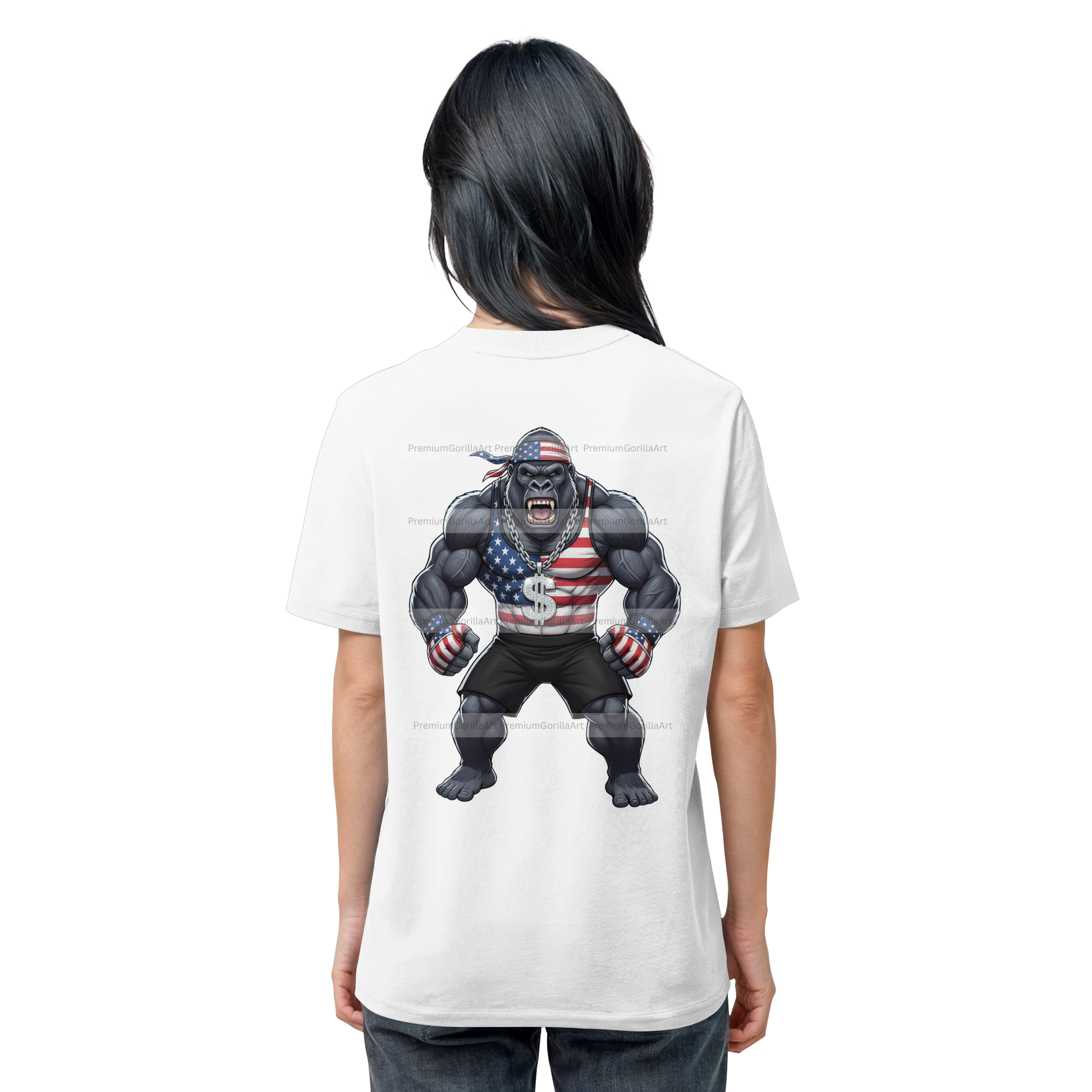 💎 DESIGN FEATURES: • Aggressiver Gorilla im MMA Fighter Style • USA Flag Bandana, Tank Top & MMA Gloves • Silberne Dollar-Kette mit Diamant-Pendant • Premium Streetwear Ästhetik • Polierter, glänzender Finish